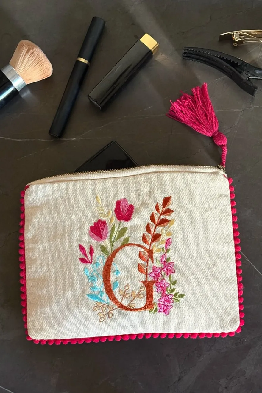 Este neceser con la inicial «G» y delicadas flores de distintos colores bordadas, añade un toque personal y distintivo, combinando funcionalidad y estilo.