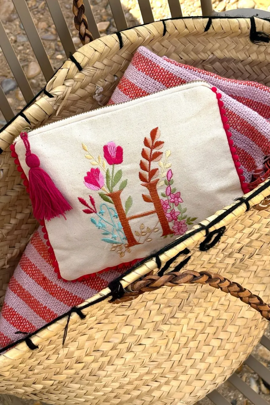 Este neceser con la inicial «H» y delicadas flores de distintos colores bordadas, añade un toque personal y distintivo, combinando funcionalidad y estilo.
