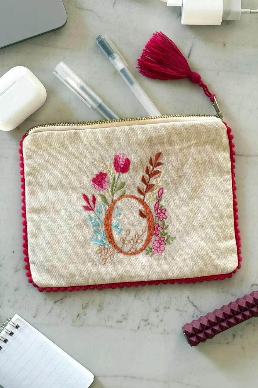 Este neceser con la inicial «O» y delicadas flores de distintos colores bordadas, añade un toque personal y distintivo, combinando funcionalidad y estilo.