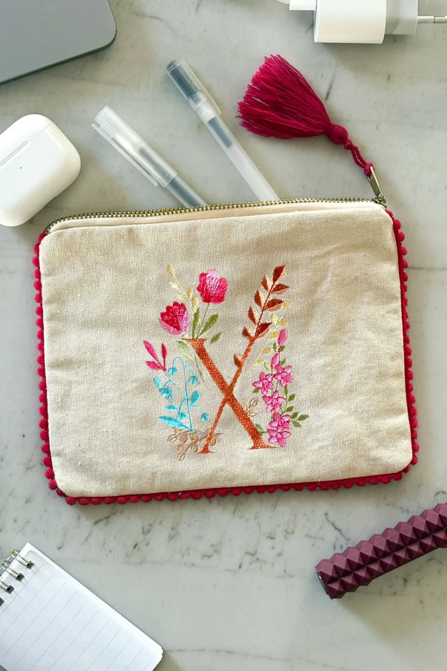 Este neceser con la inicial «X» y delicadas flores de distintos colores bordadas, añade un toque personal y distintivo, combinando funcionalidad y estilo.