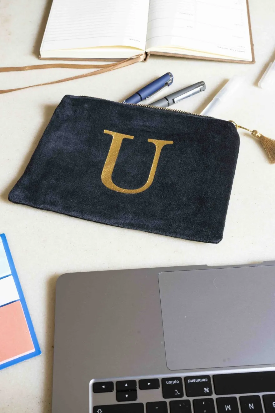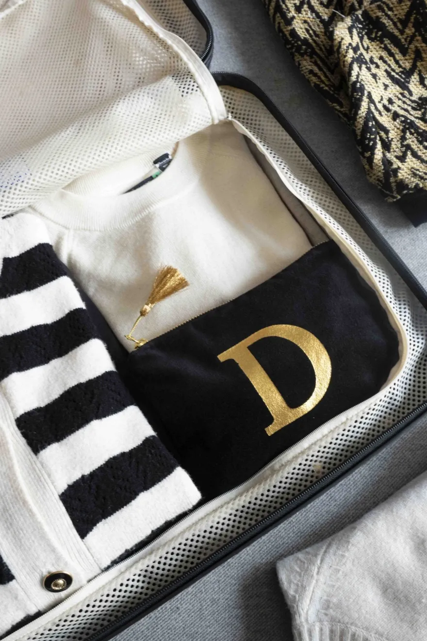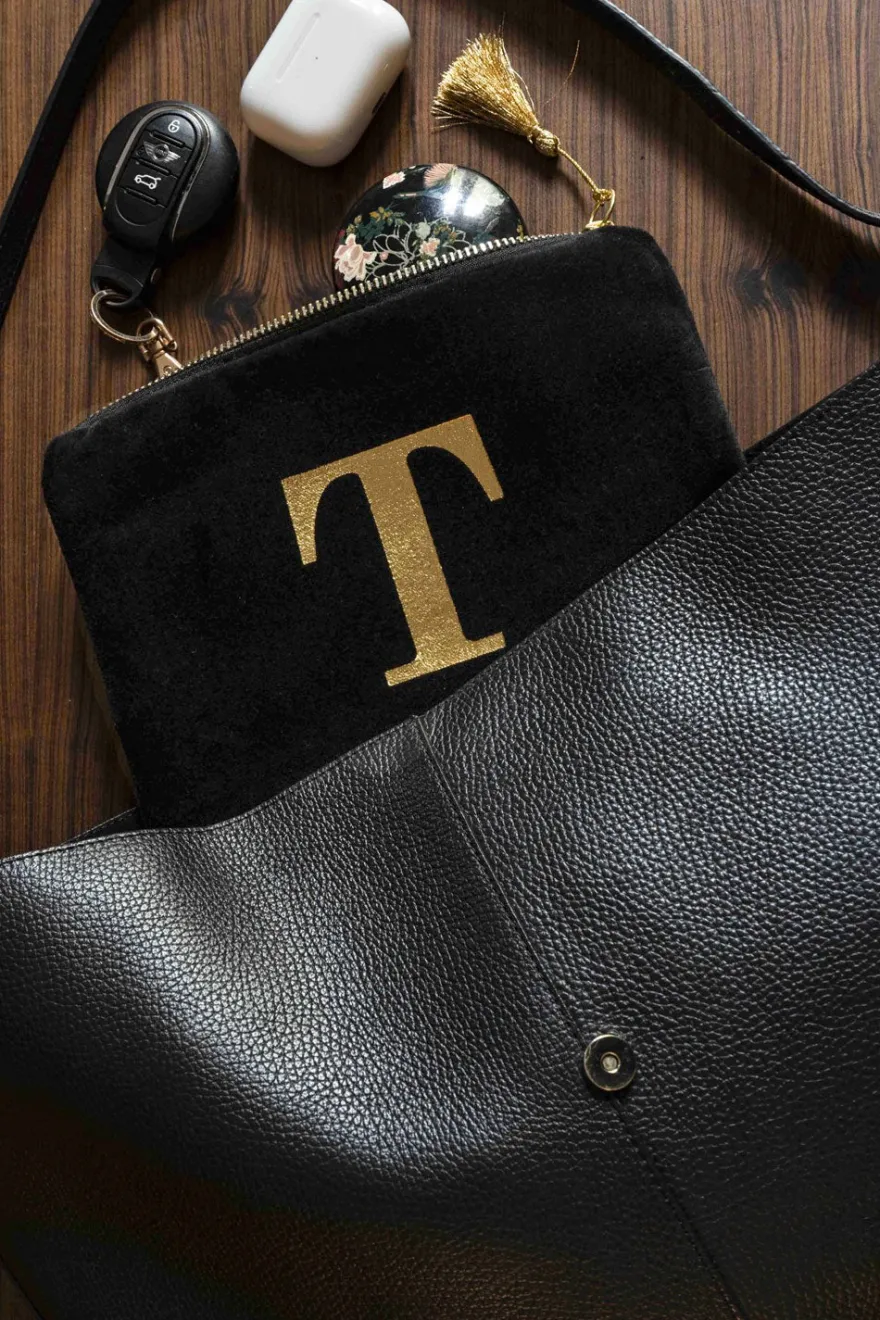 Elegante neceser de terciopelo negro con inicial a escoger y cremallera dorada. Su suave tejido de terciopelo aporta un toque de lujo, mientras que la inicial dorada, añade un detalle personal y distintivo.