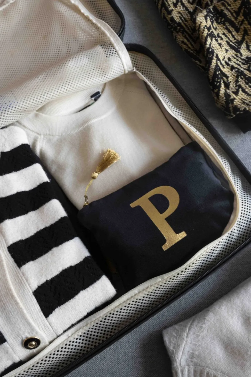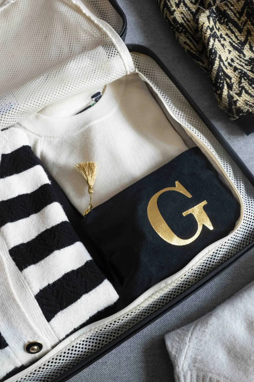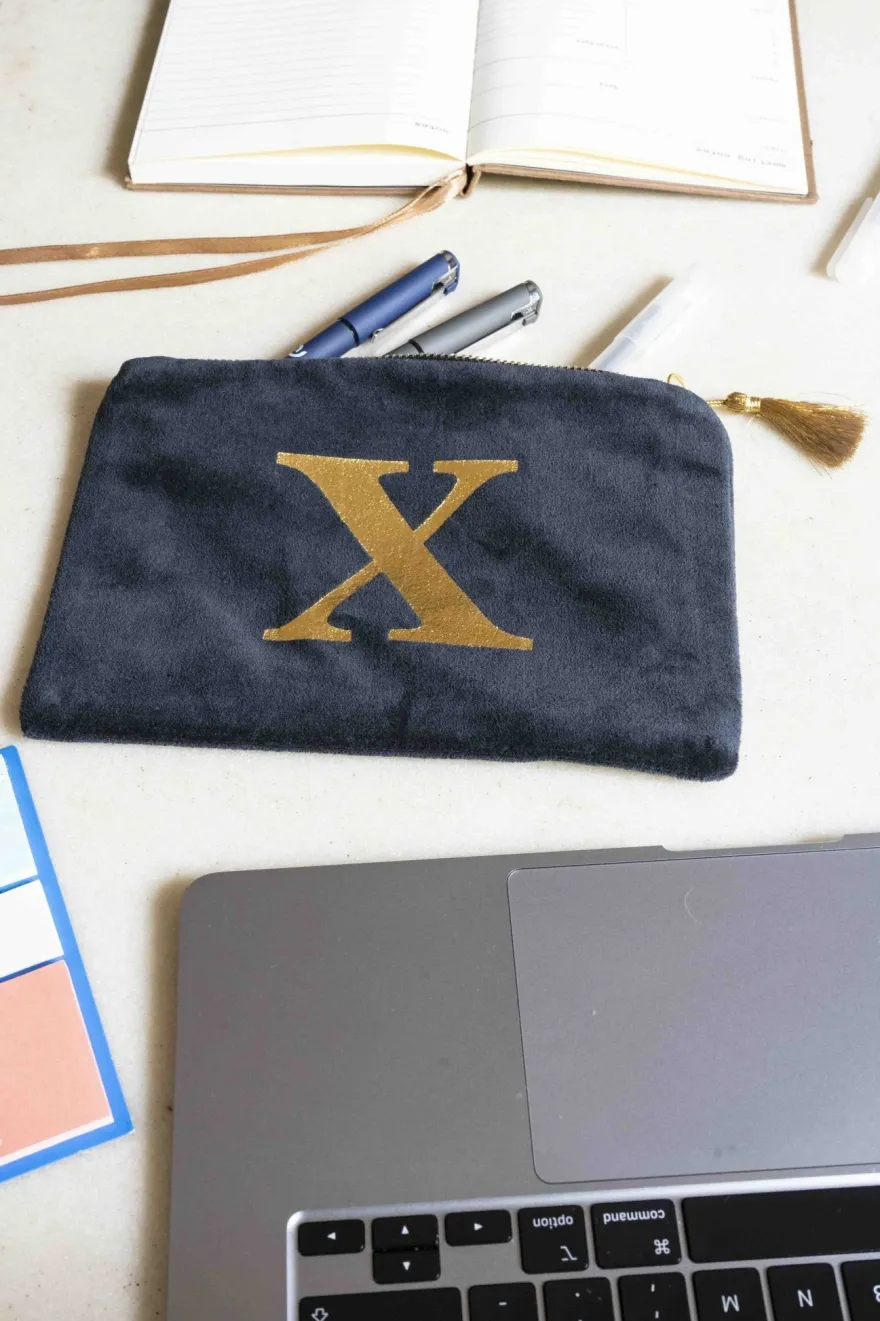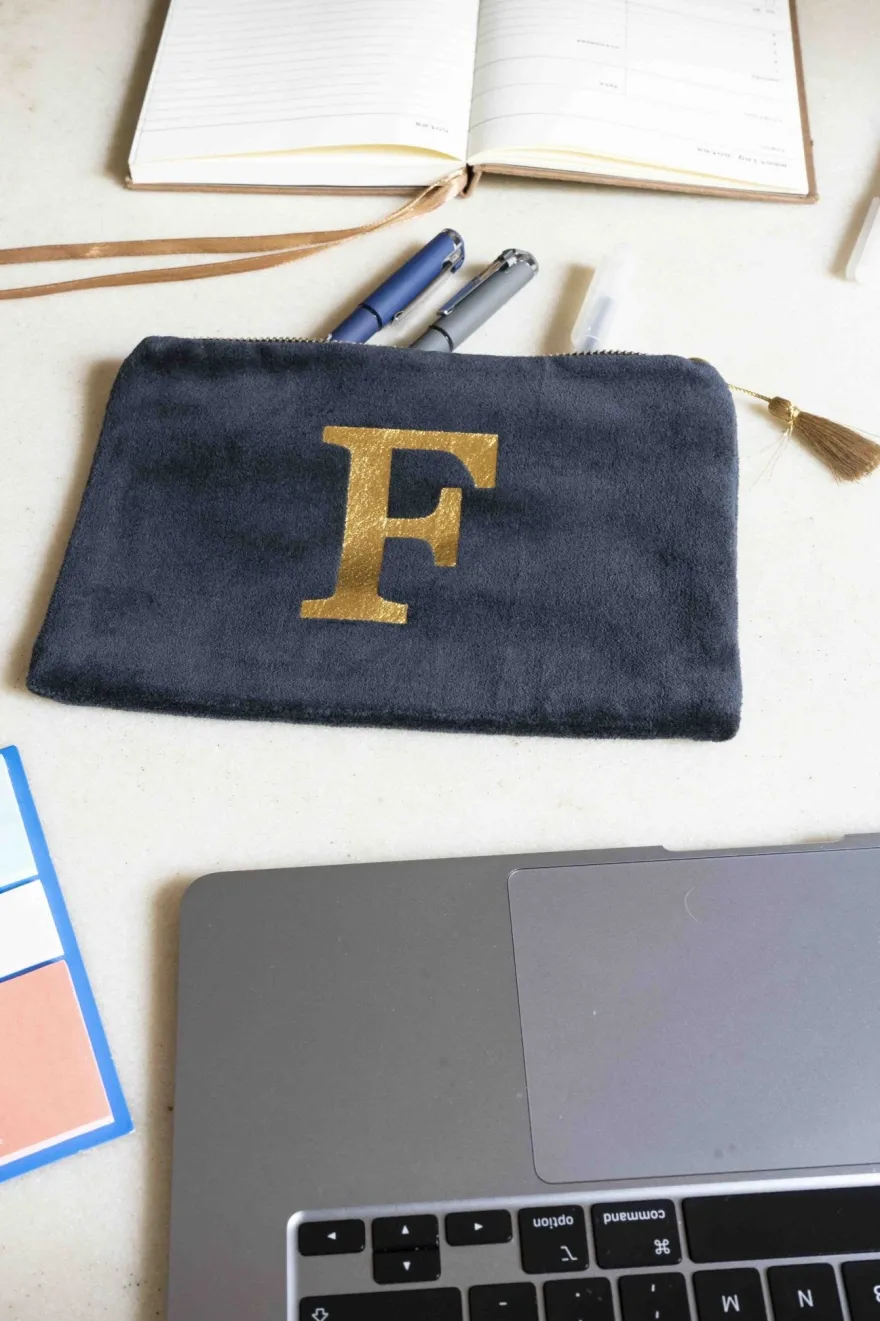 Elegante neceser de terciopelo negro con inicial a escoger y cremallera dorada. Su suave tejido de terciopelo aporta un toque de lujo, mientras que la inicial dorada, añade un detalle personal y distintivo.
