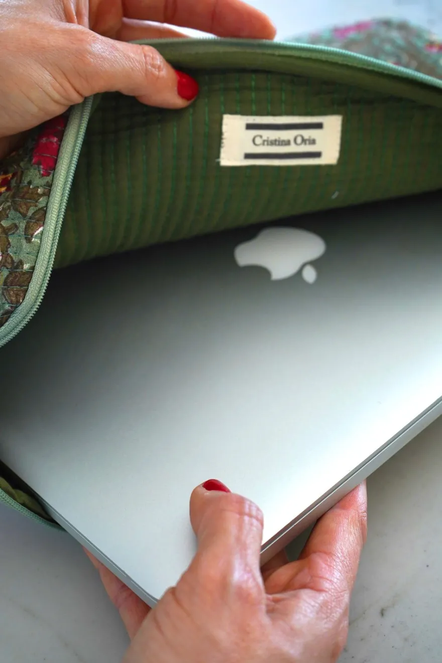 Funda acolchada con cremallera para ordenadores portátiles o ipads, perfecta para viajar o para llevarla a diario dentro del bolso. Está confeccionada en 100% algodón y pintada a mano en la India.