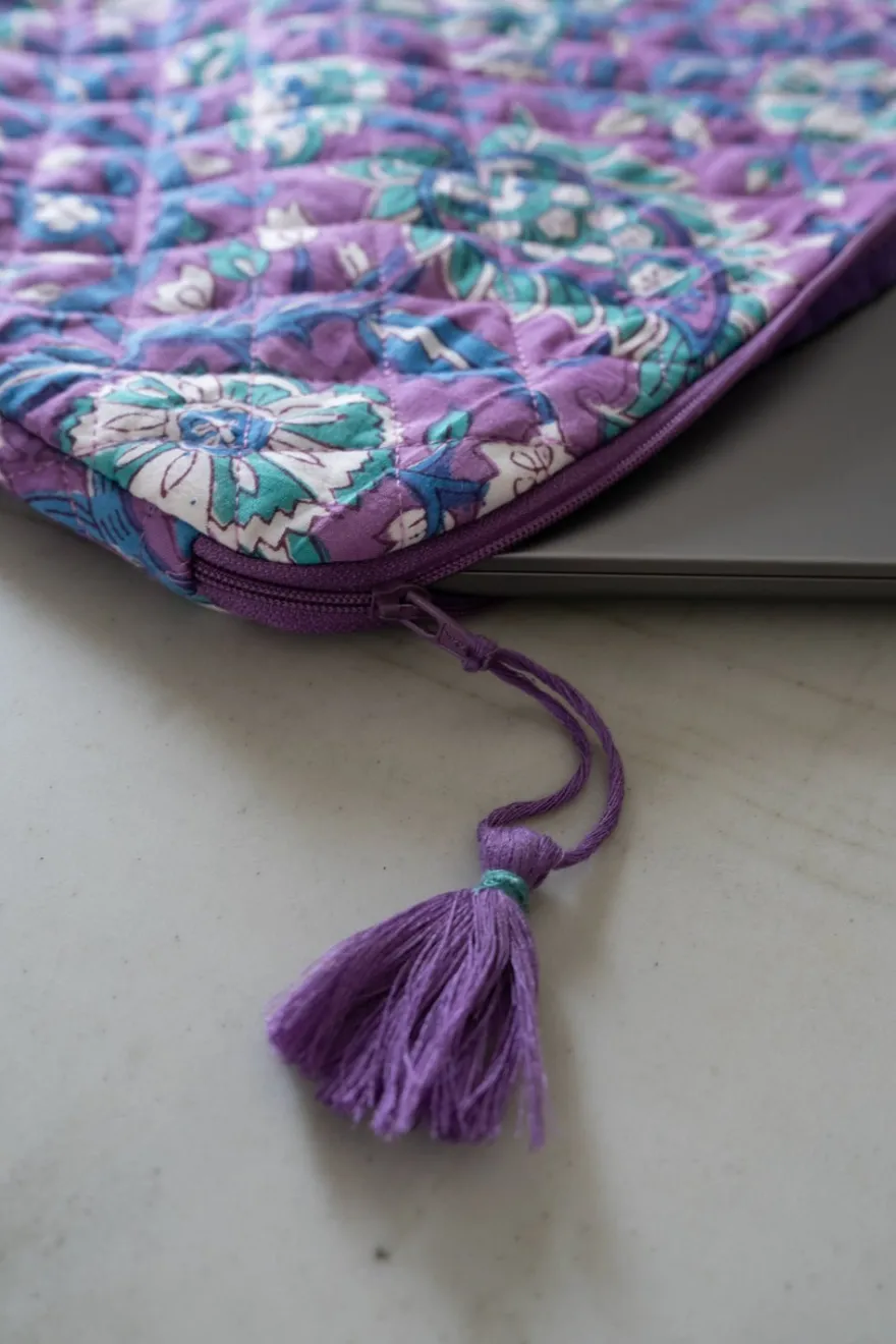 Funda acolchada con cremallera para ordenadores portátiles o ipads, perfecta para viajar o para llevarla a diario dentro del bolso. Está confeccionada en 100% algodón y pintada a mano en la India.