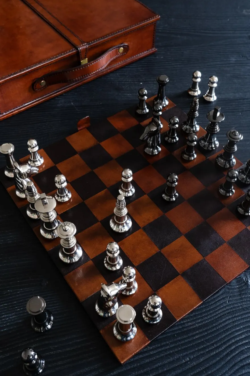 Elegante maletín de cuero con set completo de 32 piezas de ajedrez de aluminio y tablero de madera. Este conjunto es más que un juego, ya que además de transformar tus partidas de ajedrez en una experiencia verdaderamente especial, aporta elegancia y estilo a la decoración de cualquier rincón de casa.