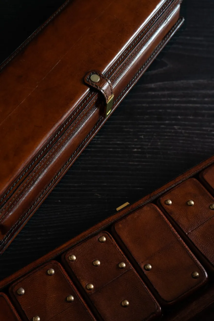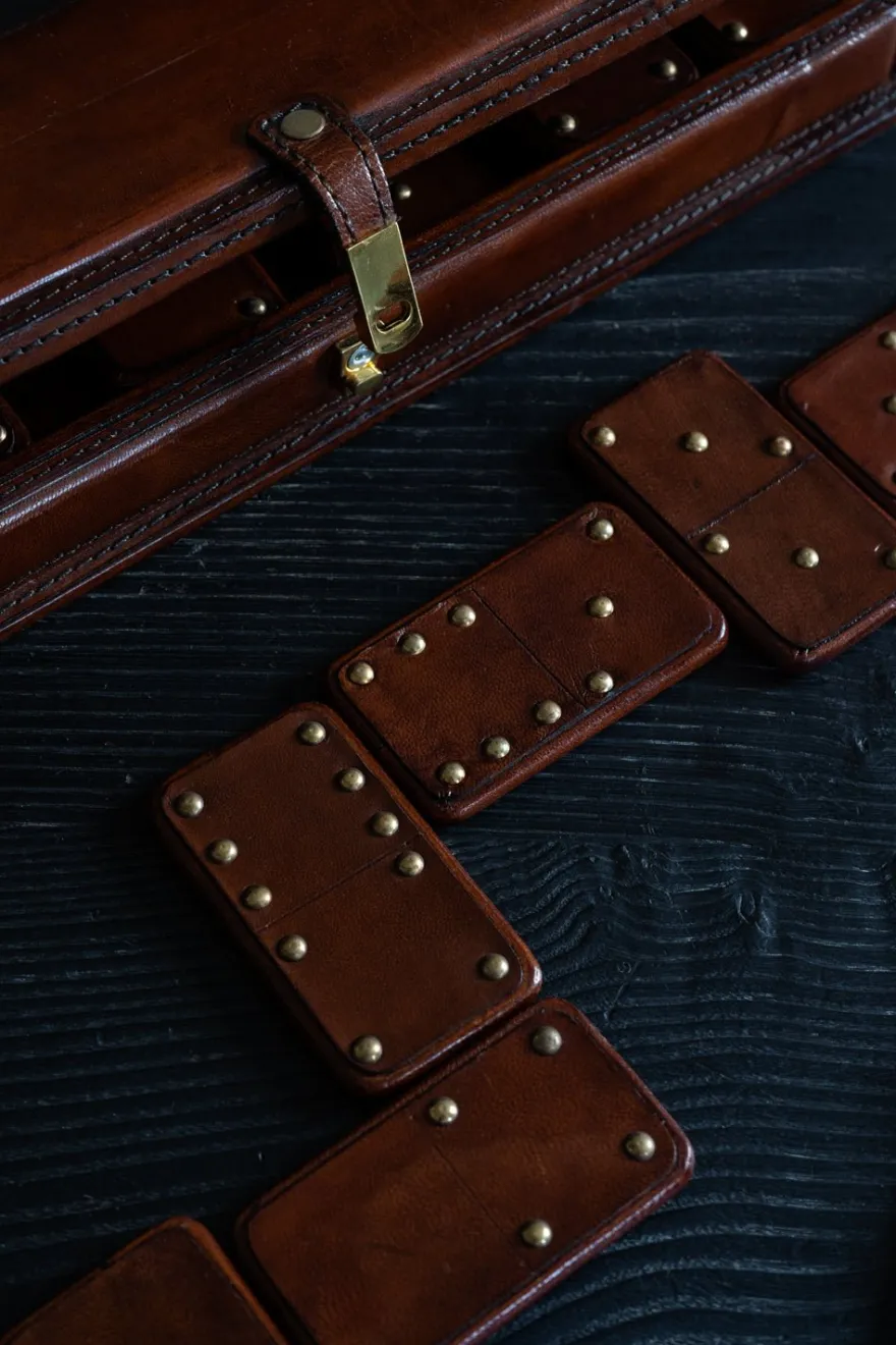 Elegante maletín de cuero con piezas de dominó de madera. Este conjunto es más que un juego, ya que además de transformar tus partidas en una experiencia verdaderamente especial, aporta elegancia y estilo a la decoración de cualquier rincón de casa.