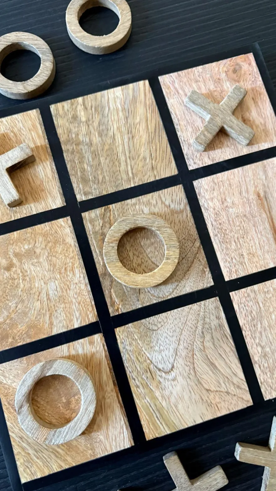 Incluye el tablero y las fichas en forma de X y O, también de madera, con un acabado suave y agradable al tacto.