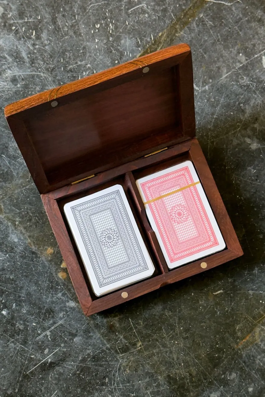 Set de dos barajas de cartas presentado en una elegante caja de madera de sheesham, conocida por su resistencia y vetas naturales. La tapa está decorada con cartas doradas, que aportan un toque distintivo y sofisticado. Ideal para juegos en casa, reuniones o como regalo especial, combina funcionalidad y diseño en una pieza decorativa.