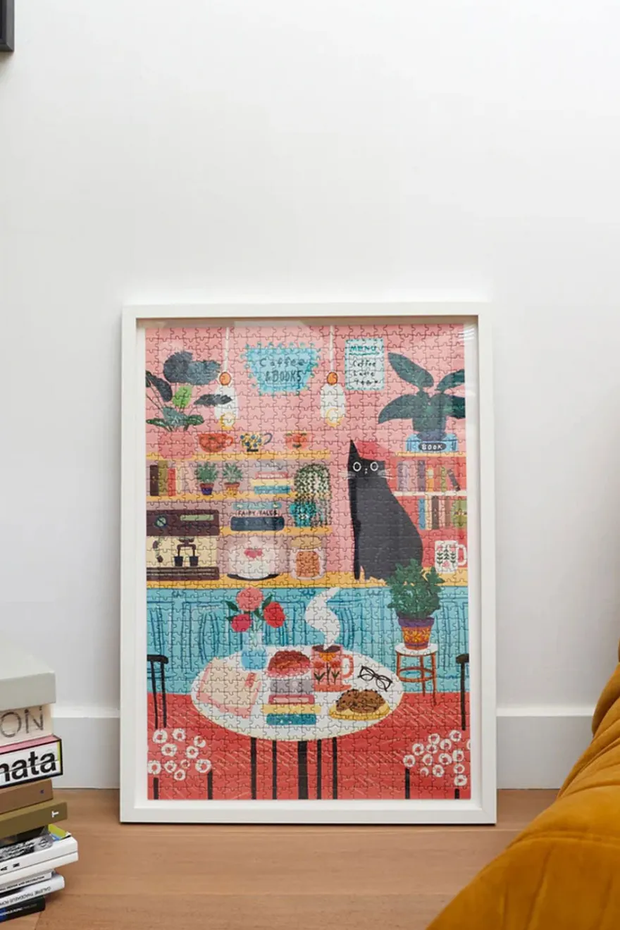 Rompecabezas de 1000 piezas que captura a un gato en una cafetería. El regalo perfecto para desconcertar y enmarcar una vez completado.