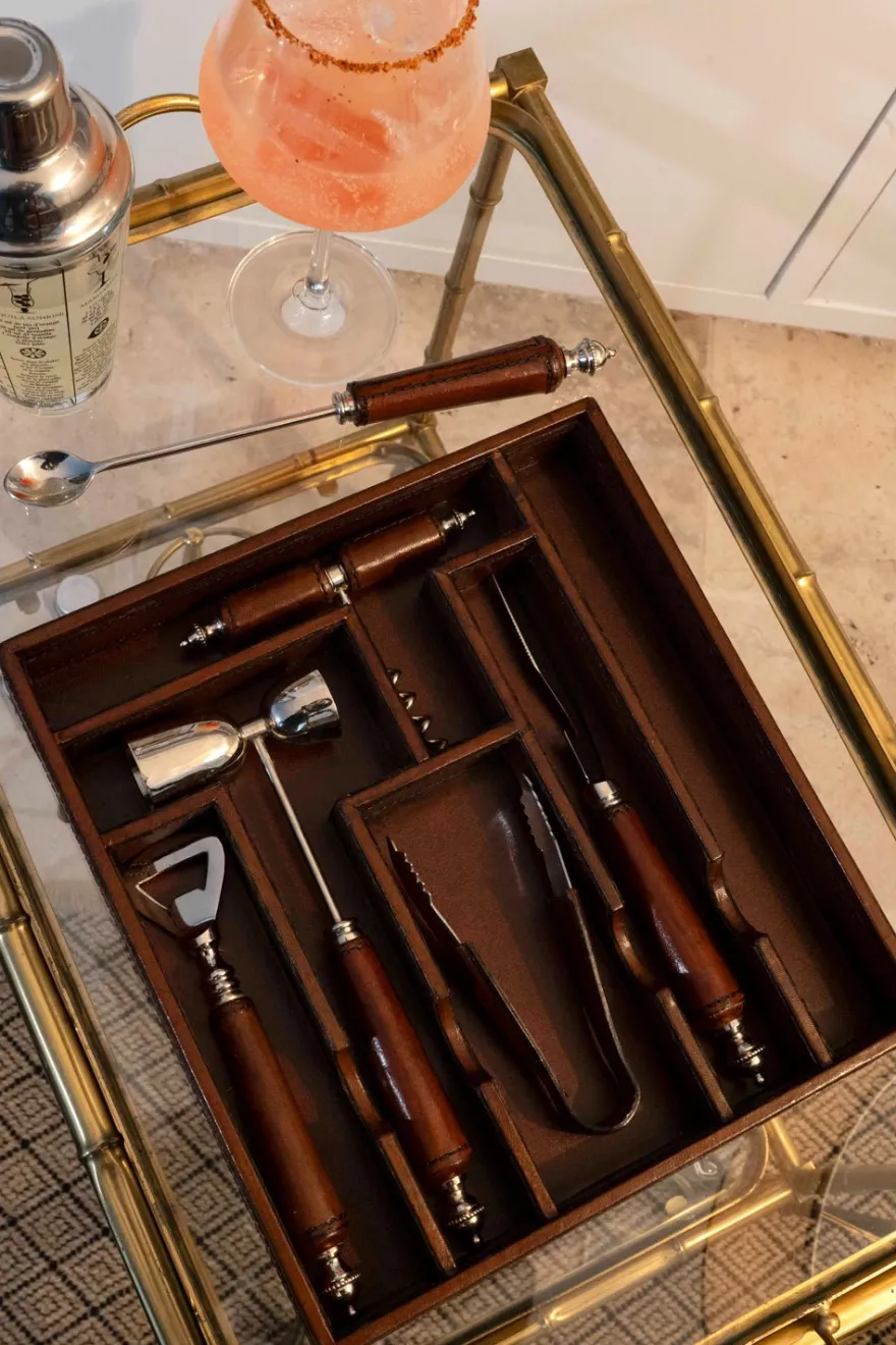 Juego de cuero especial para cócteles, con seis compartimentos y accesorios.
