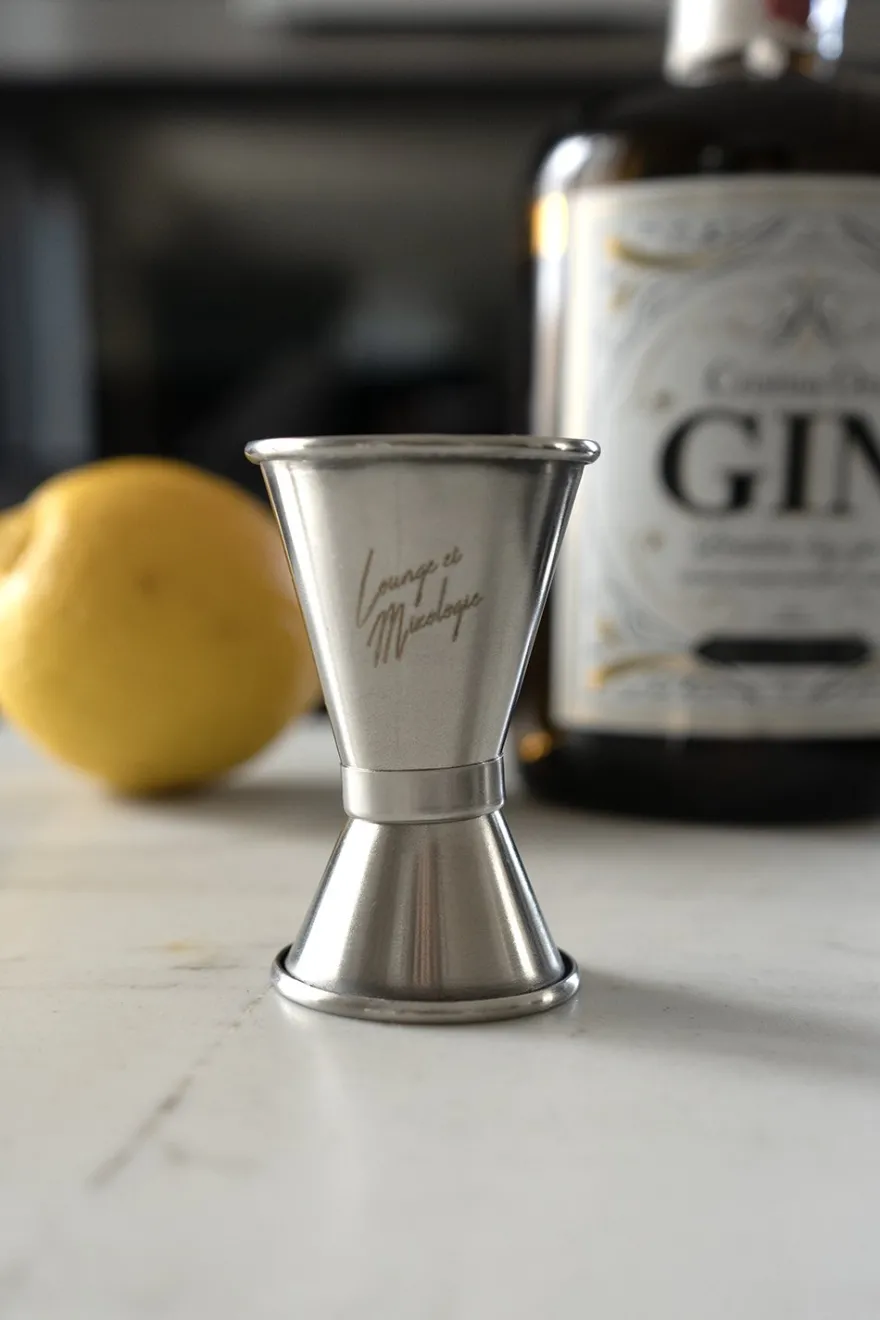 Medidor o dosificador de acero inoxidable con la impresión de «Lounge et Mixologie».
