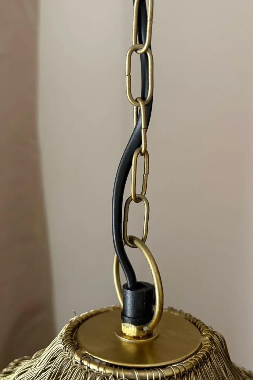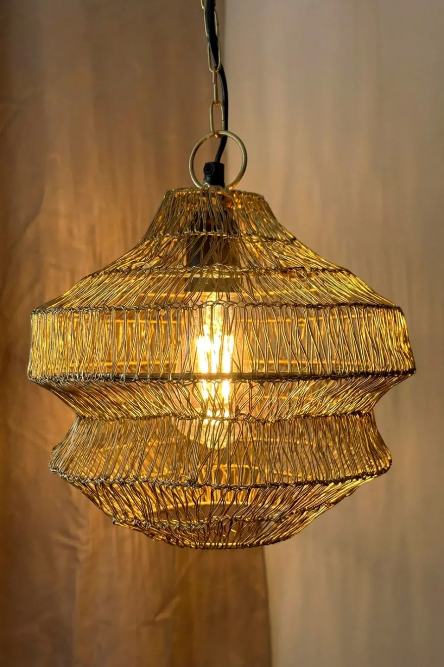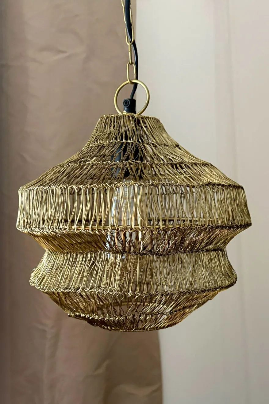 Lámpara colgante fabricada en hierro con acabado dorado desgastado, que aporta un elegante aire vintage. Su estructura de metal trenzado crea un juego de volúmenes y relieves que envuelven la bombilla, permitiendo que la luz se filtre suavemente y genere una iluminación cálida y acogedora.