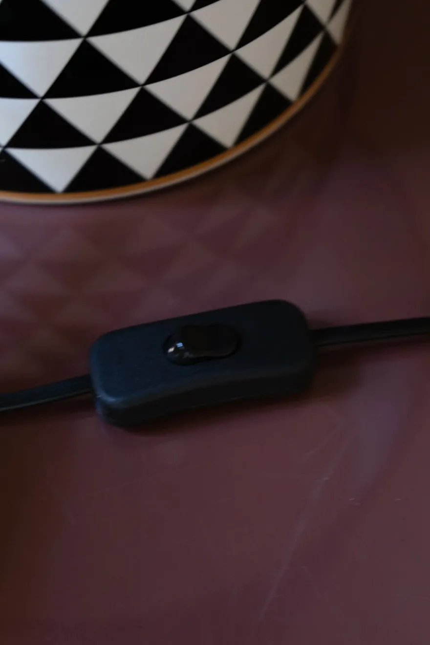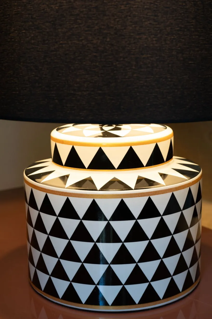 Lámpara de diseño con motivos geométricos en blanco y negro , de material artístico y lujoso, ideal para dar un toque sobrio y elegante a cualquier espacio.