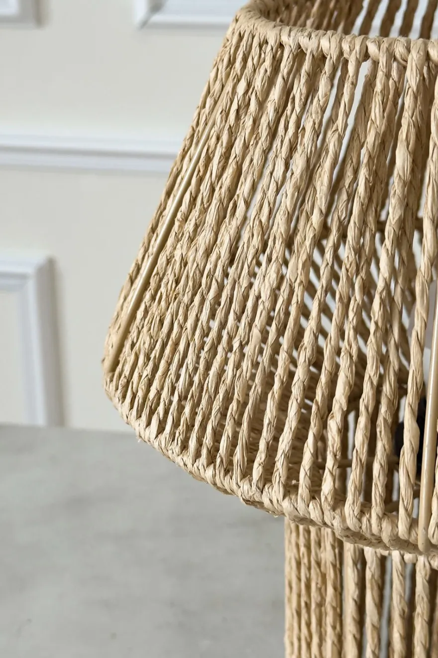 Lámpara de mesa decorativa con un elegante diseño de cuerdas verticales que crea una luz cálida y acogedora. Fabricada en papel trenzado, perfecta para colocar en mesas auxiliares, mesillas de noche o aparadores, aportando textura y estilo al espacio.
