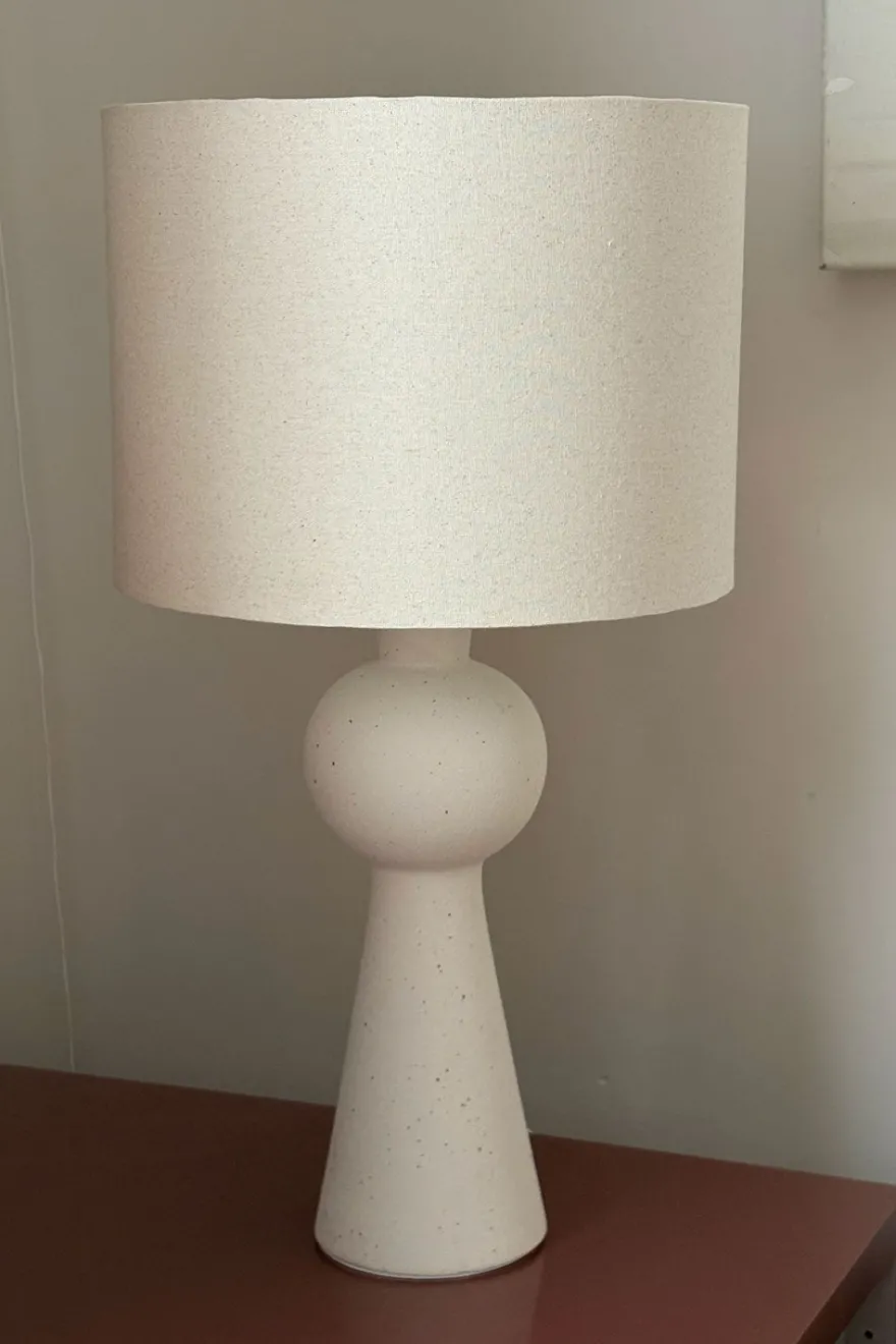 Lámpara de sobremesa de estilo minimalista fabricada en cerámica con acabado en tono natural, que aporta un toque sereno y elegante a cualquier espacio. Su base combina formas geométricas creando un diseño equilibrado y contemporáneo.