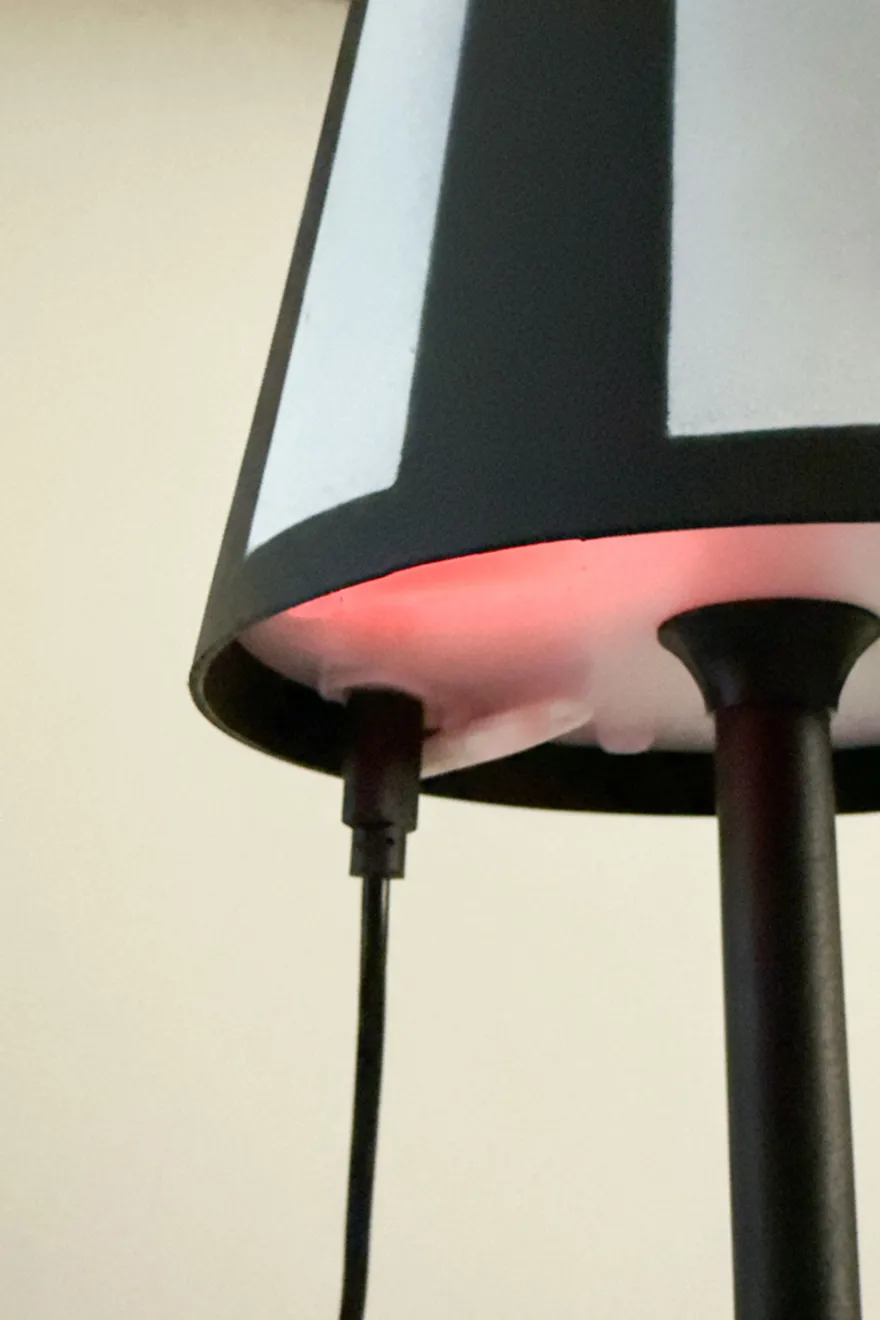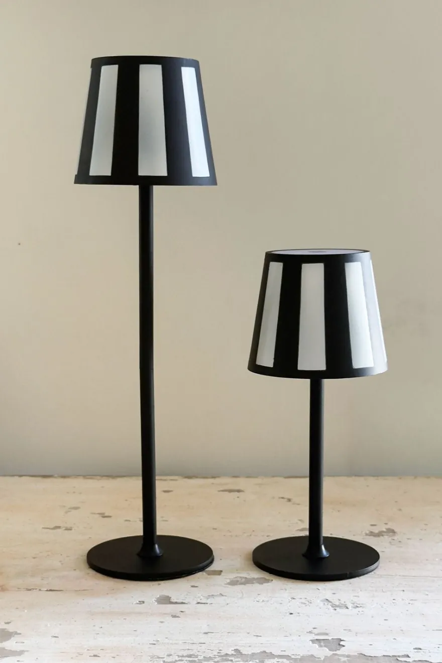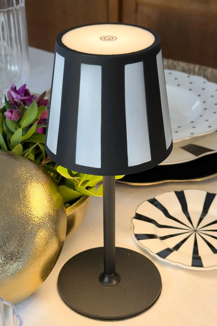 Lámpara con diseño de rayas blancas y negras, que combina estilo y funcionalidad.