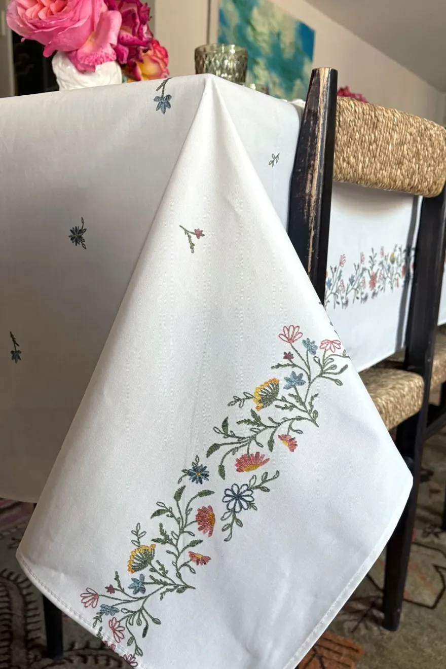 Mantel con diseño bordado de flores y acabado con dobladillo de 100% algodón que ha sido tratado específicamente para repeler las manchas.
