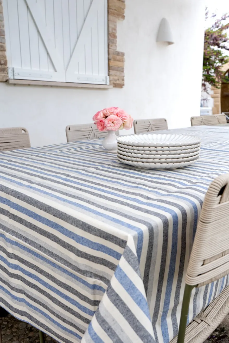 Mantel con diseño de rayas azules y acabado con dobladillo, de 50% algodón y 50% poliéster, que ha sido tratado específicamente para repeler las manchas.