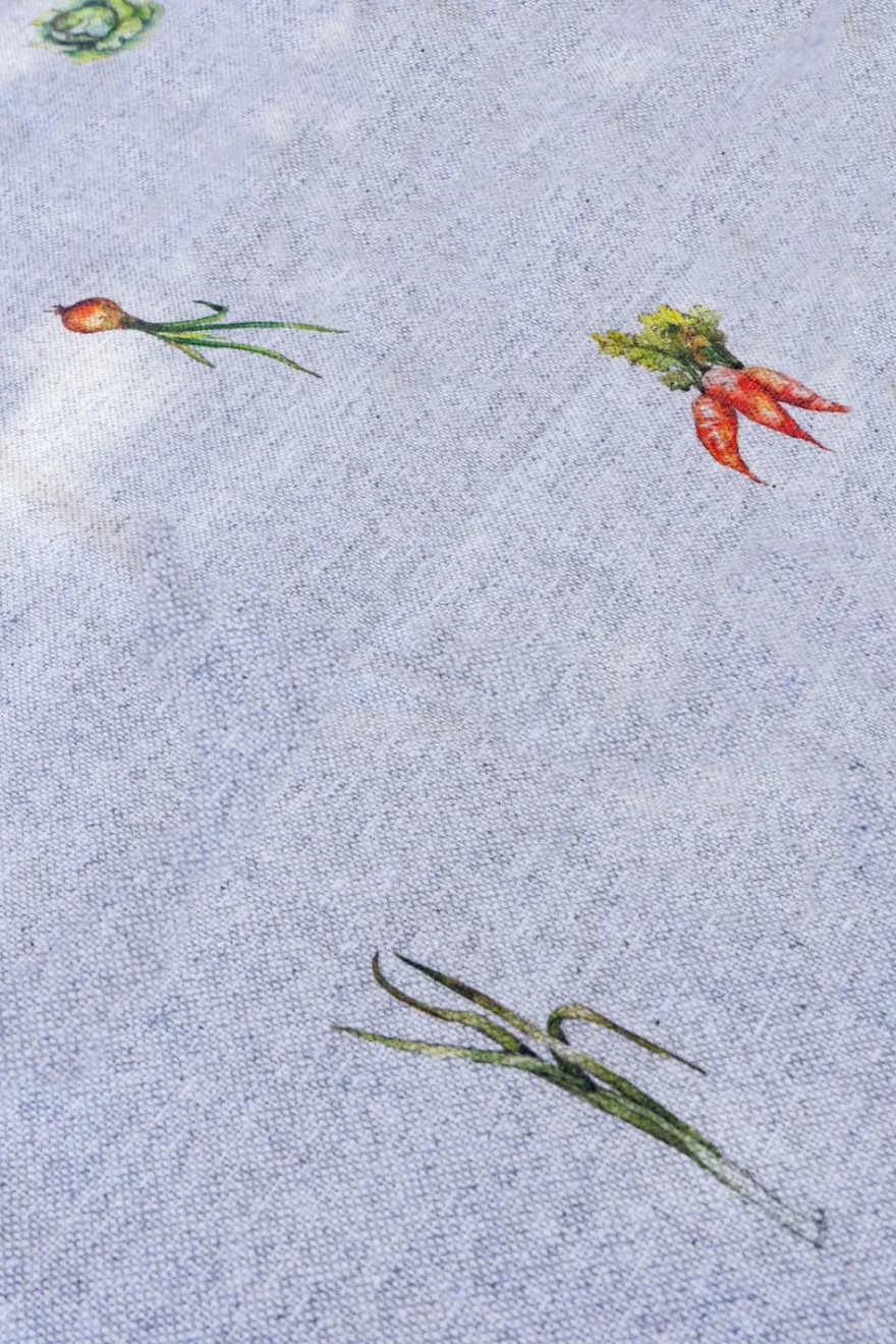 Mantel con diseño de hortalizas y acabado con dobladillo, de 80% algodón que ha sido tratado específicamente para repeler las manchas.