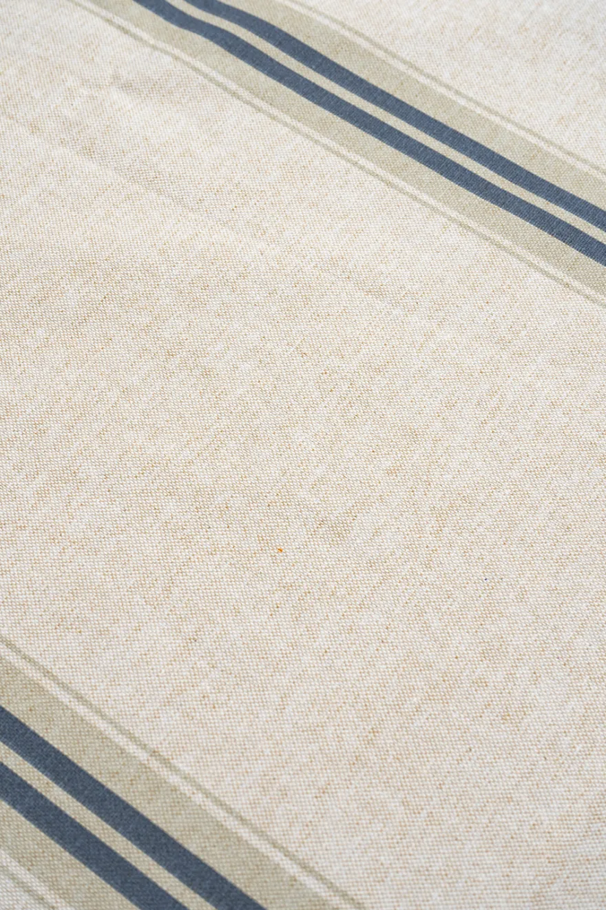 Mantel con diseño de rayas grises y acabado con dobladillo de tejido natural imitando al lino, de 80% algodón y 20% poliéster que ha sido tratado específicamente para repeler las manchas.