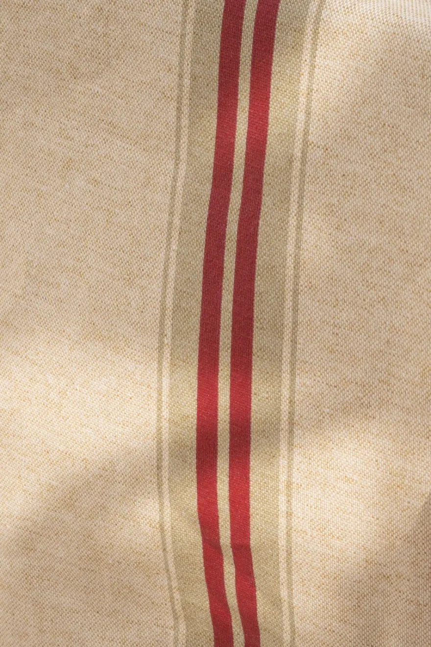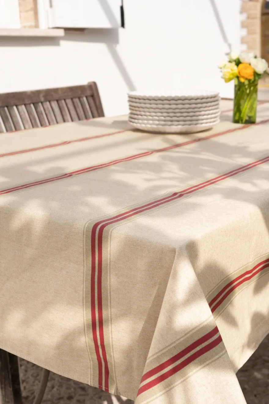 Mantel con diseño de rayas rojas y acabado con dobladillo de tejido natural imitando al lino, de 80% algodón y 20% poliéster que ha sido tratado específicamente para repeler las manchas.
