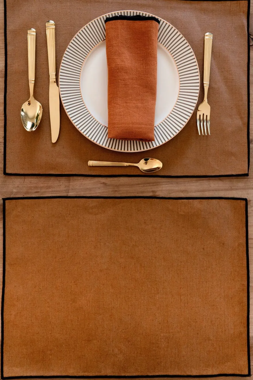 Individual de lino revestido con aspecto resinado hecho a mano, en color ocre con borde en color negro, que le dará un aspecto fresco, elegante y lujoso a tu mesa. Se puede usar a diario o para una gran celebración.