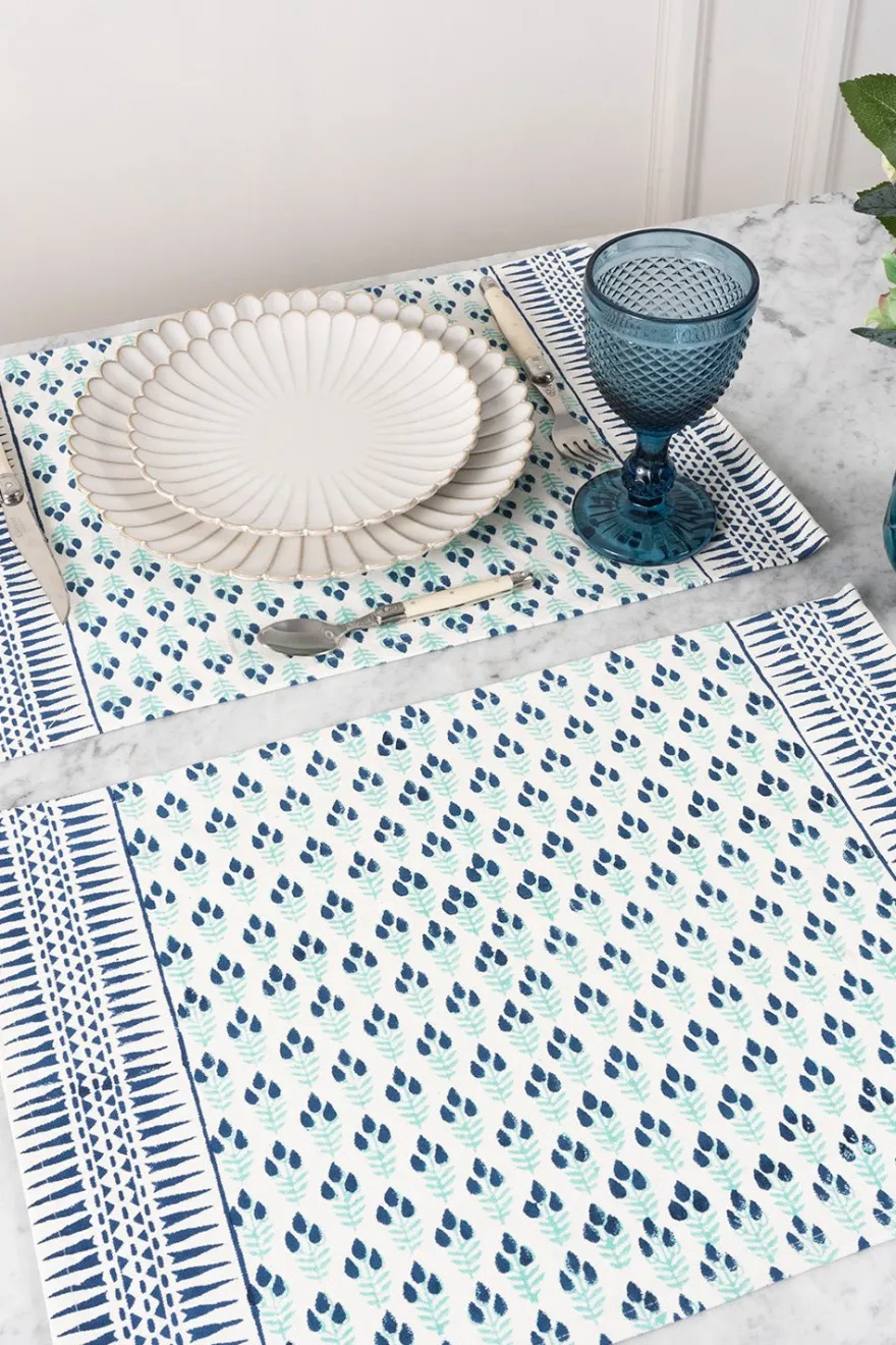 Mantel individual 100% algodón con diseño Mira cuyo significado es “Océano”, pintado a mano en la India.
