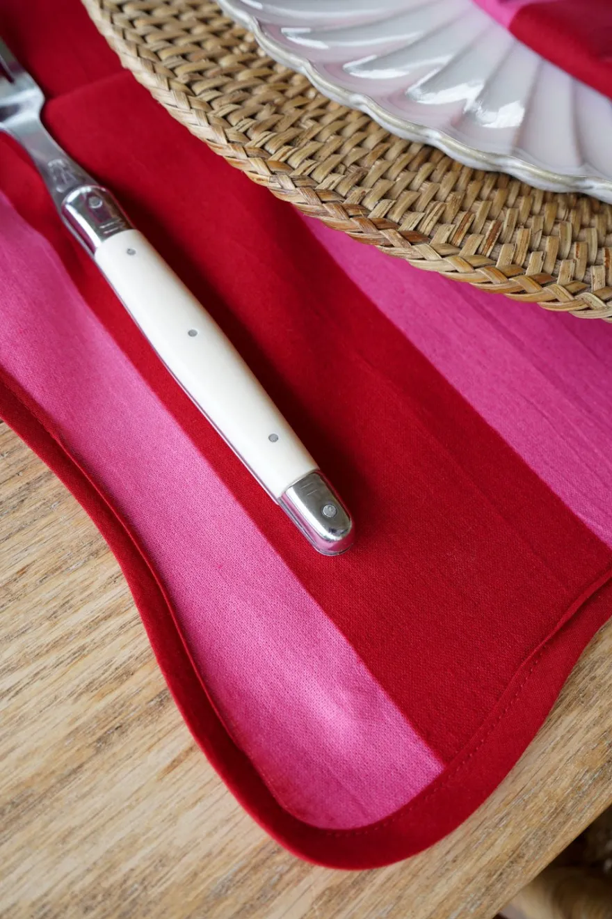Mantel individual de 100% algodón con borde ondulado y diseño de rayas rosas y rojas pintado a mano en la India. Perfecto para celebraciones, comidas al aire libre o simplemente para alegrar el día a día.