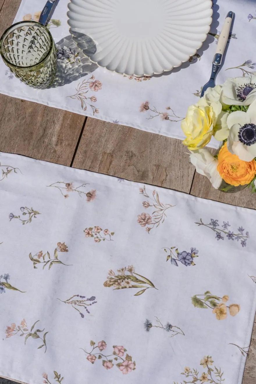 Manteles con diseño primavera y acabado con dobladillo de 100% algodón que ha sido tratado específicamente para repeler las manchas.