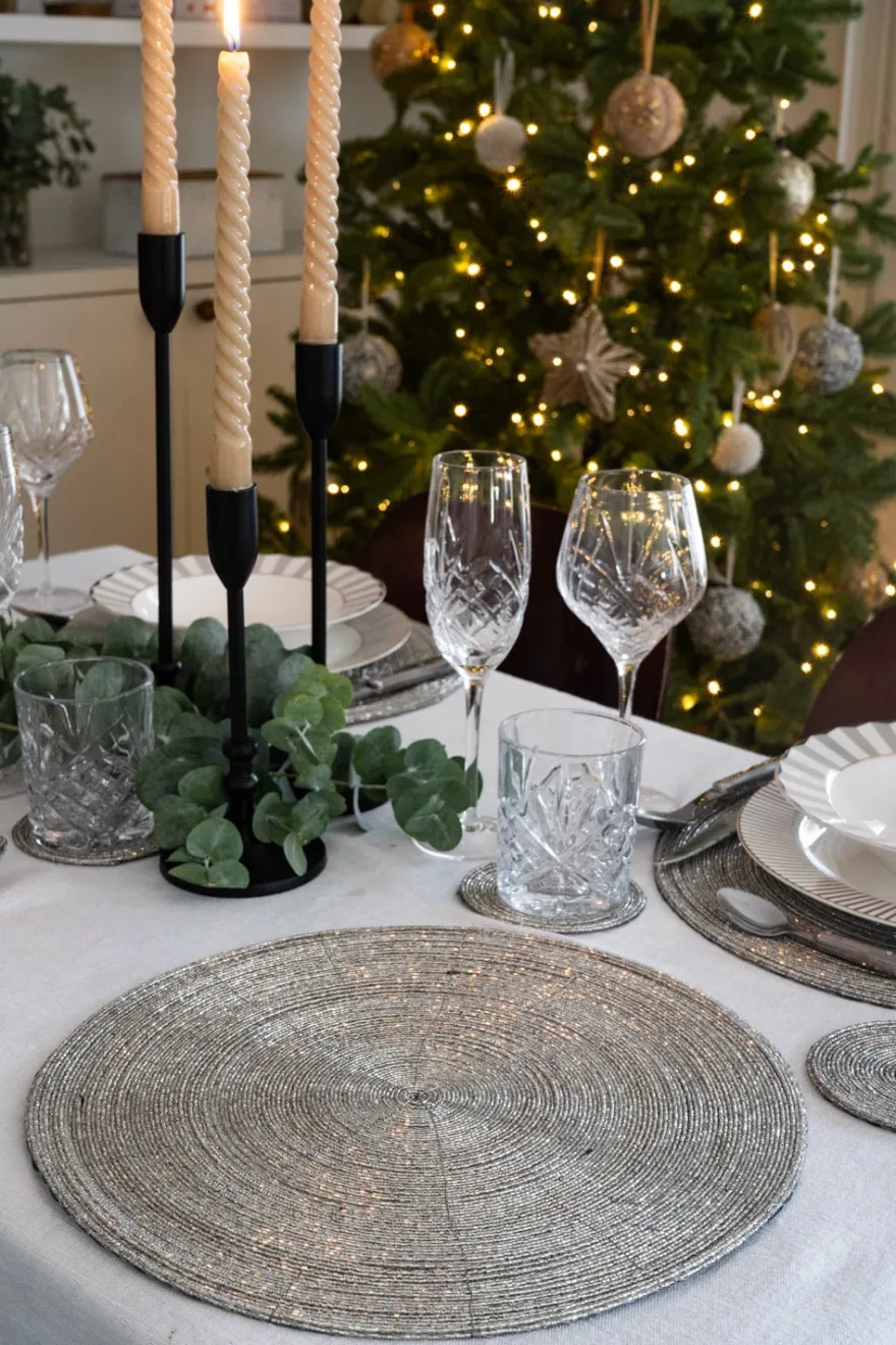 Este mantel individual o bajoplato destaca por su exquisito bordado a mano con cuentas de bolitas con diseño plateado, que le da un toque de lujo y sofisticación a cualquier mesa. Las bolitas están cuidadosamente cosidas en patrones delicados, creando texturas y relieves que combinan elegancia con un diseño artístico único. Perfecto para cenas especiales o para elevar la decoración diaria de tu mesa.