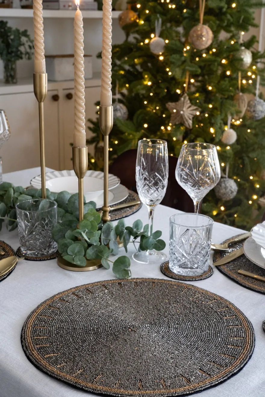 Este mantel individual o bajoplato destaca por su exquisito bordado a mano con cuentas de bolitas con diseño plateado y detalles dorados, que le da un toque de lujo y sofisticación a cualquier mesa. Las bolitas están cuidadosamente cosidas en patrones delicados, creando texturas y relieves que combinan elegancia con un diseño artístico único. Perfecto para cenas especiales o para elevar la decoración diaria de tu mesa.