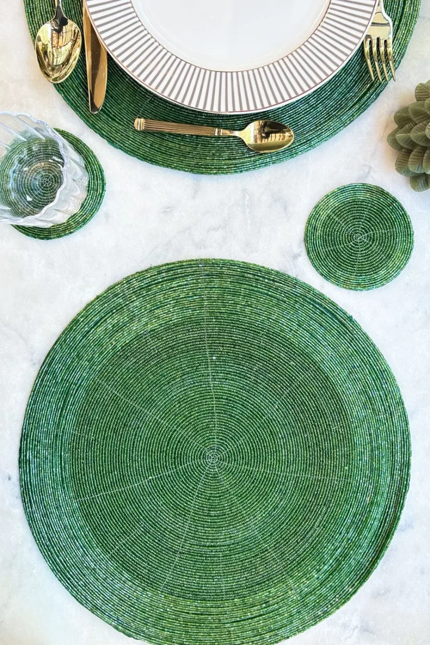 Este mantel individual o bajoplato destaca por su exquisito bordado a mano, elaborado con finas cuentas verdes que aportan un toque de lujo adicional. Cada bolita está cuidadosamente cosida formando patrones delicados que crean una combinación única de textura, relieve y elegancia artística. Su diseño sofisticado transforma cualquier mesa, haciéndolo ideal tanto para cenas especiales como para elevar la decoración del día a día.