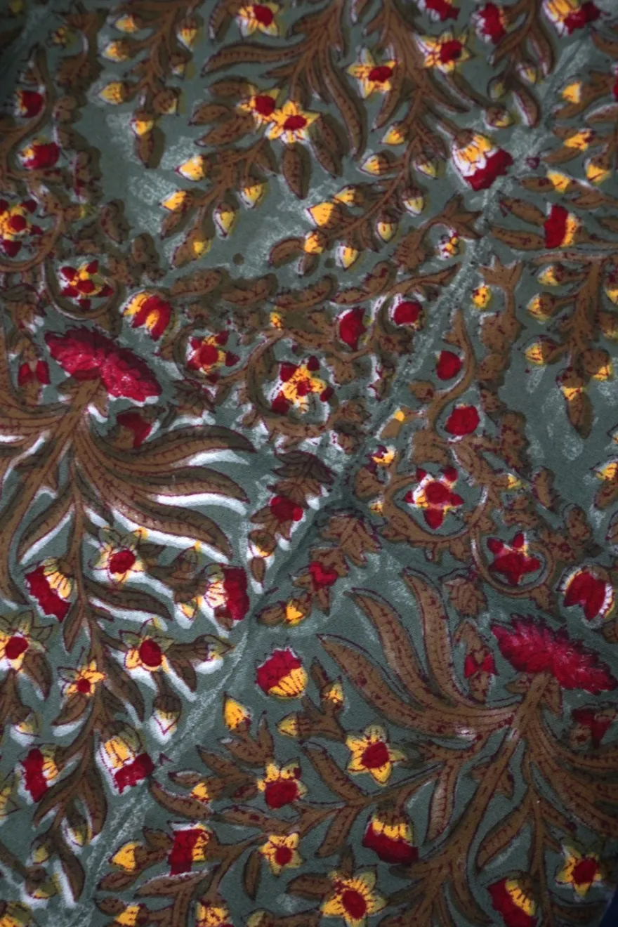 Mantel de 100% algodón con diseño de flores verdes pintado a mano en la India. Perfecto para celebraciones, comidas al aire libre o simplemente para alegrar el día a día.
