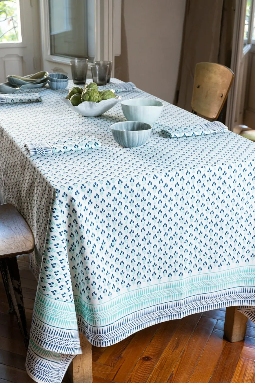 Mantel 100% algodón con diseño Mira, cuyo significado es “Océano”, pintado a mano en la India.