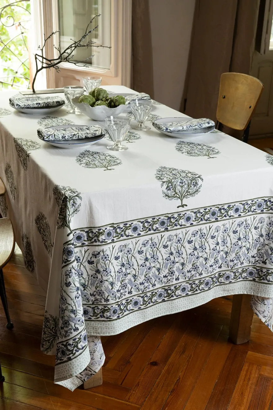 Mantel 100% algodón con diseño Shanta, cuyo significado es “Pacífica”, pintado a mano en la India.