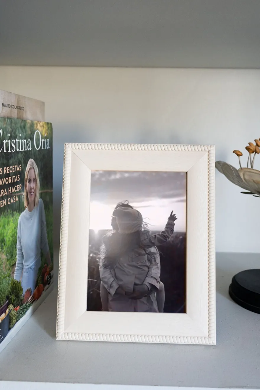 Marco de fotos o portarretratos con borde de madera y detalle en relieve, ideal para decorar cualquier rincón de tu casa.