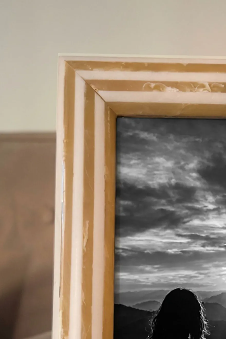 Marco de fotos elaborado en resina, con un elegante diseño de rayas blancas y amarillas que aporta luminosidad y un estilo fresco y moderno. Fabricado de manera artesanal, cada pieza presenta patrones únicos e irrepetibles.