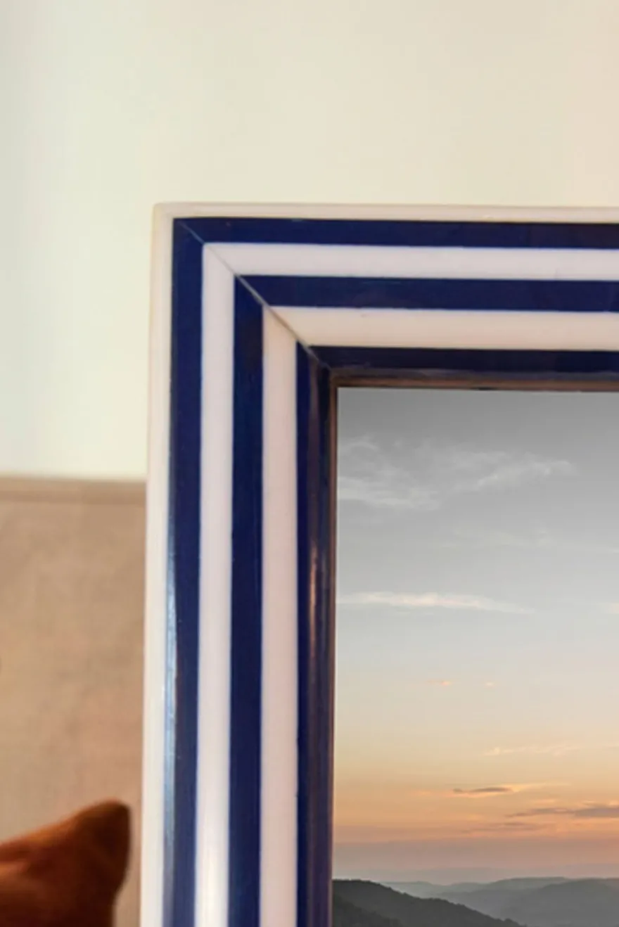Marco de fotos elaborado en resina, con un elegante diseño de rayas blancas y azules que aporta frescura y un estilo clásico y contemporáneo a la vez. Fabricado de manera artesanal, cada pieza presenta patrones únicos e irrepetibles.