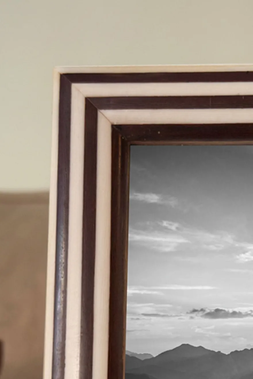 Marco de fotos elaborado en resina, con un elegante diseño de rayas blancas y marrones que aporta calidez y un estilo natural y sofisticado. Fabricado de manera artesanal, cada pieza presenta patrones únicos e irrepetibles.