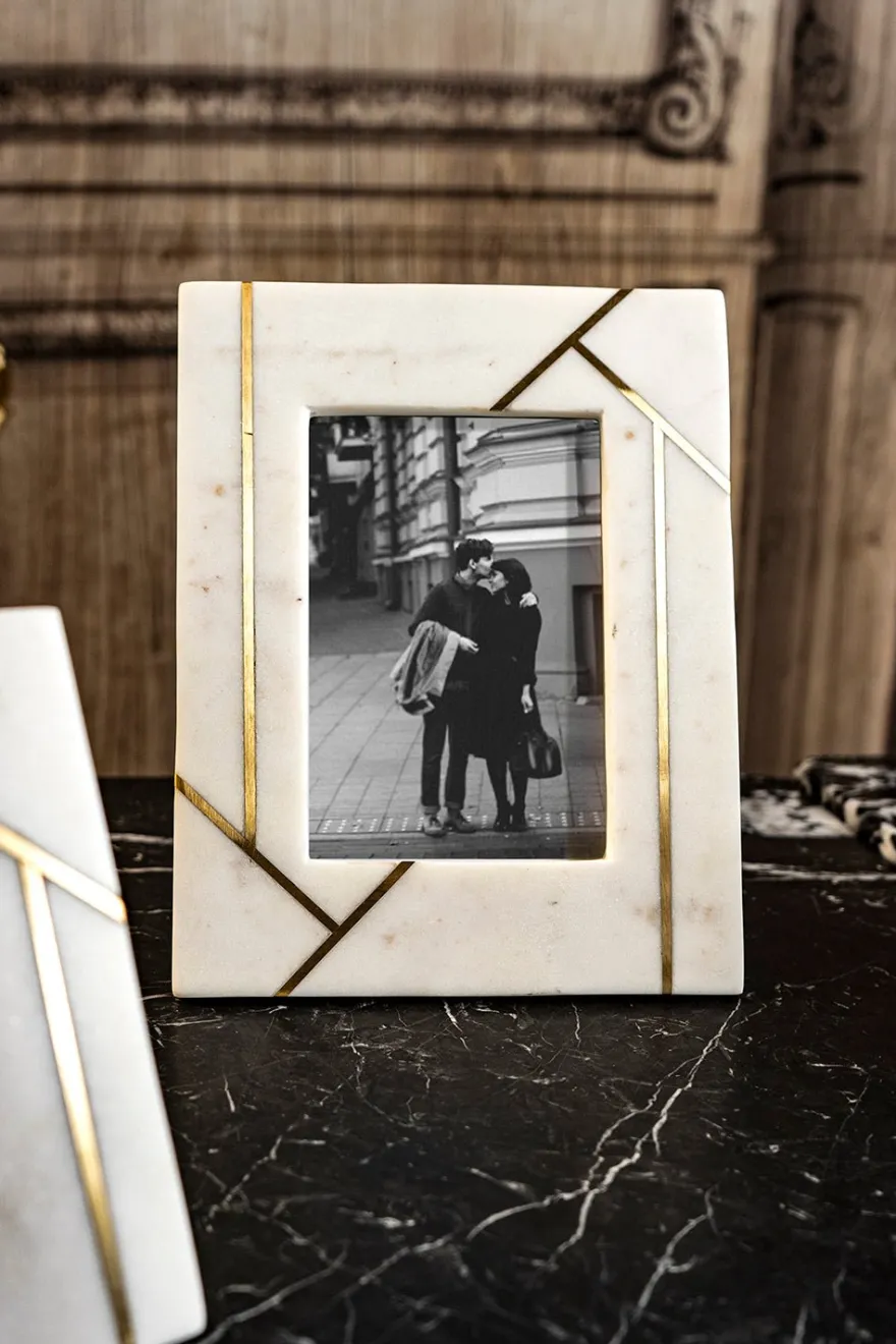Portaretratos/ marco de fotos grande de mármol con filos dorados decorando, ideal para decorar los rincones de tu casa.