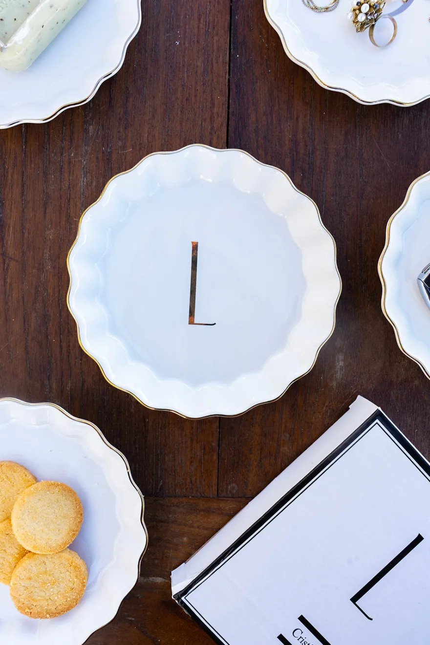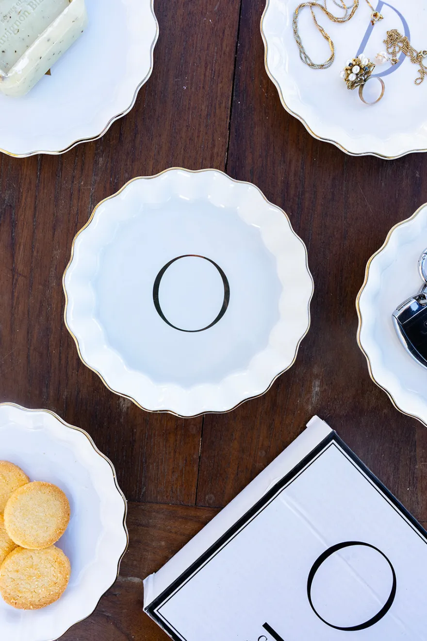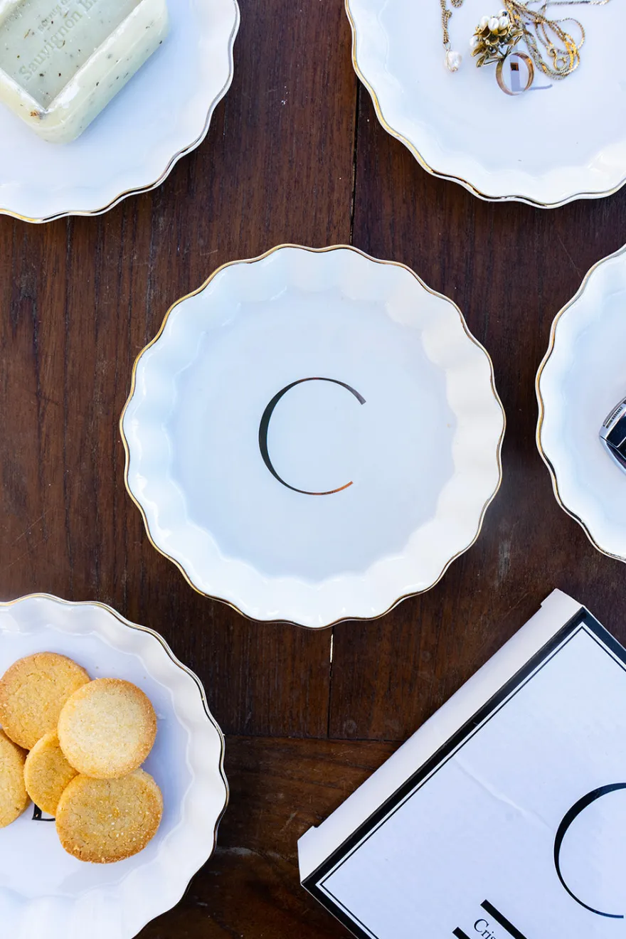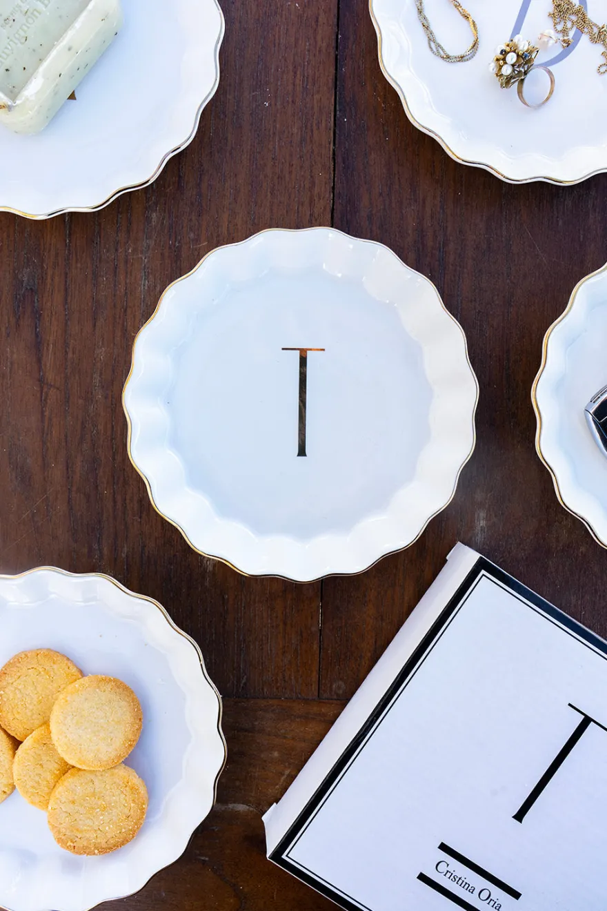 Bandejita redonda con borde ondulado y delicado filo dorado, personalizada con inicial, de new bone china con diseño propio Cristina Oria.