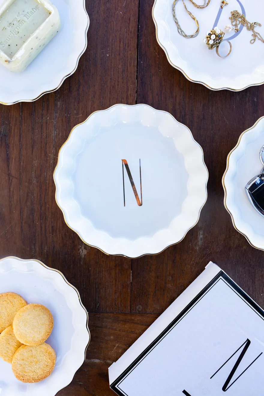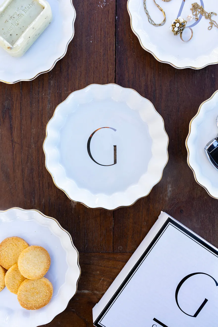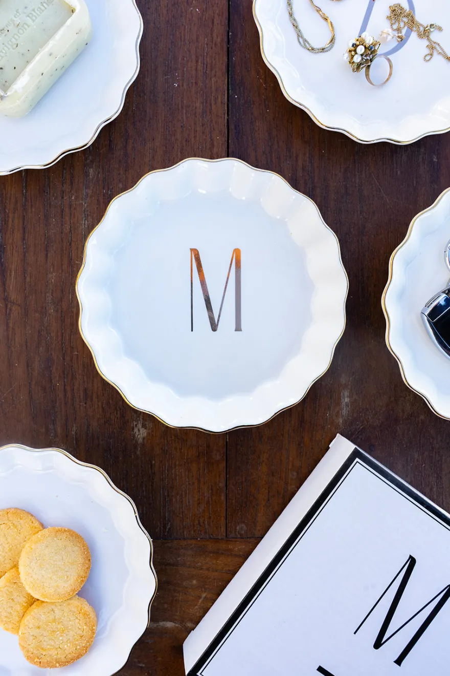 Bandejita redonda con borde ondulado y delicado filo dorado, personalizada con inicial, de new bone china con diseño propio Cristina Oria.
