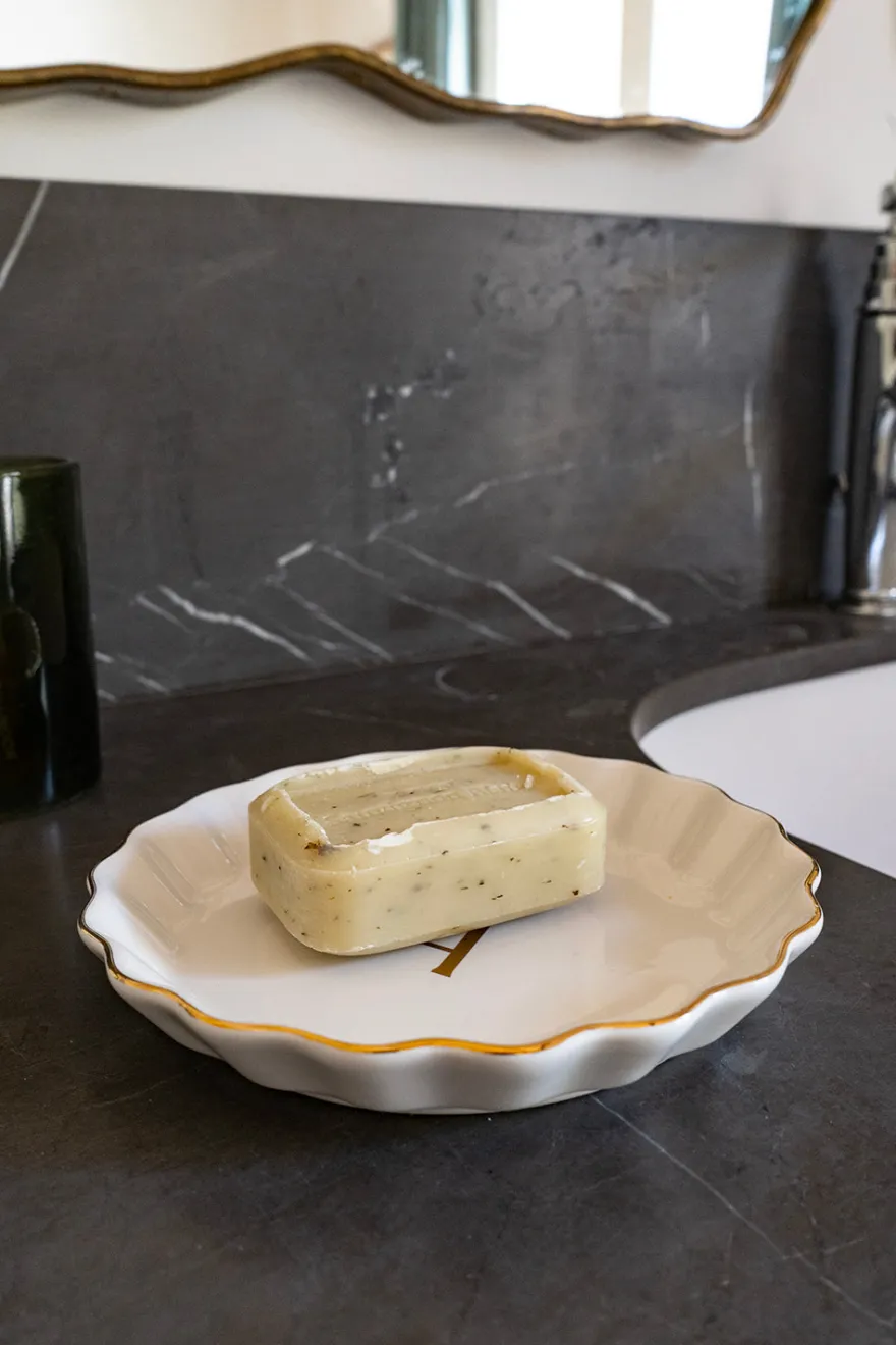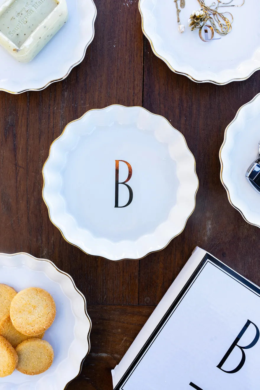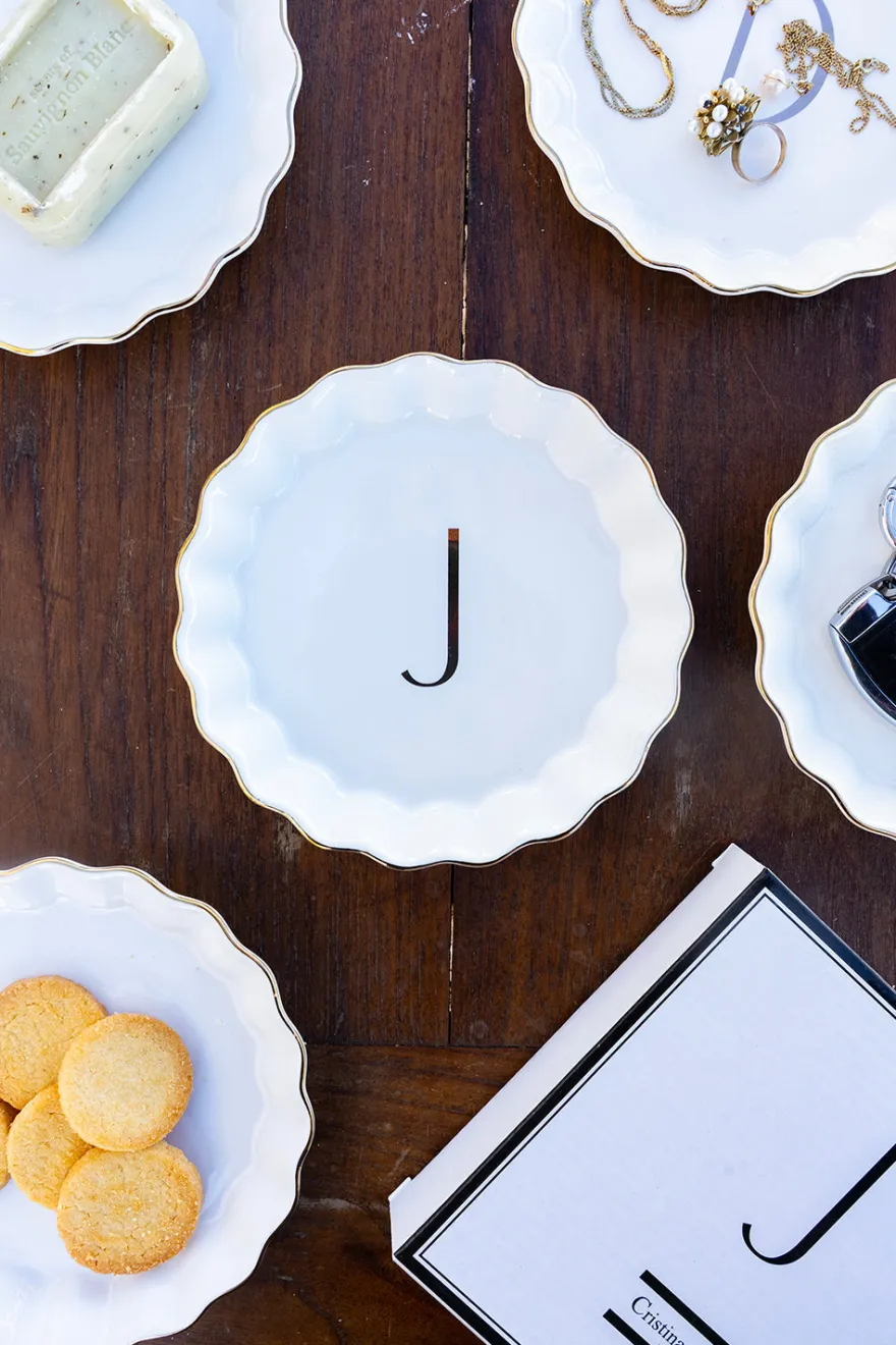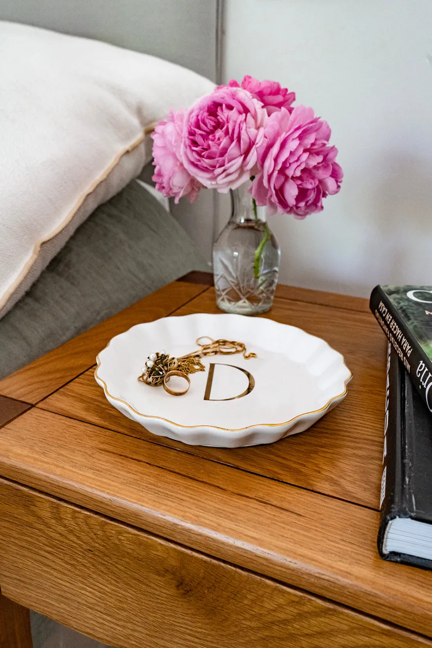 Bandejita redonda con borde ondulado y delicado filo dorado, personalizada con inicial, de new bone china con diseño propio Cristina Oria.