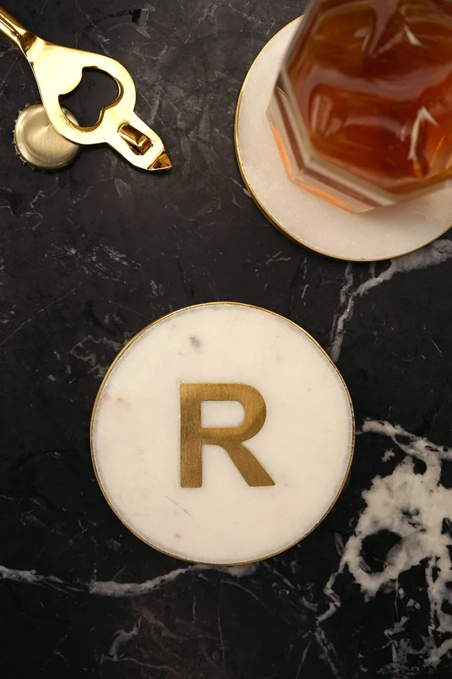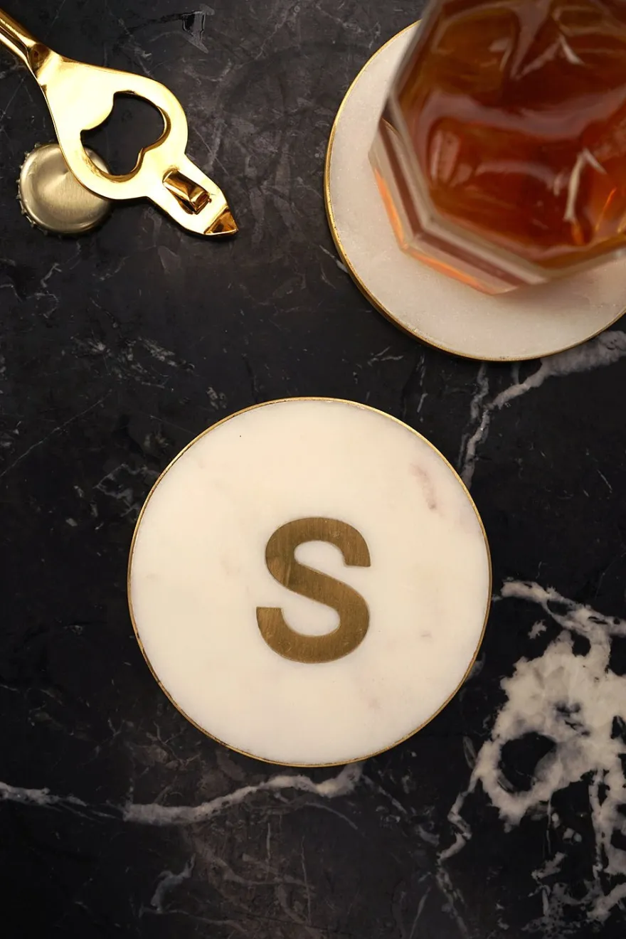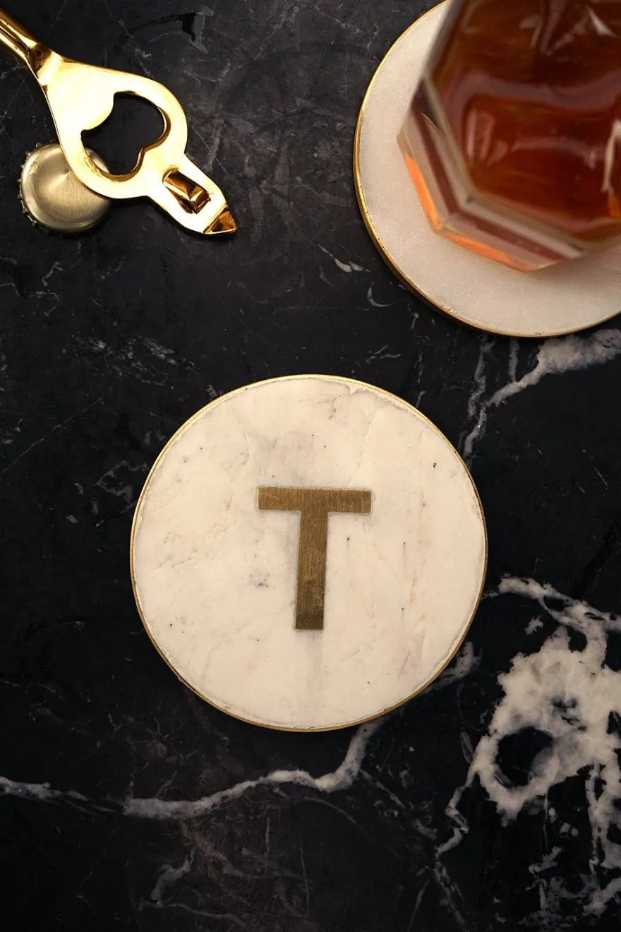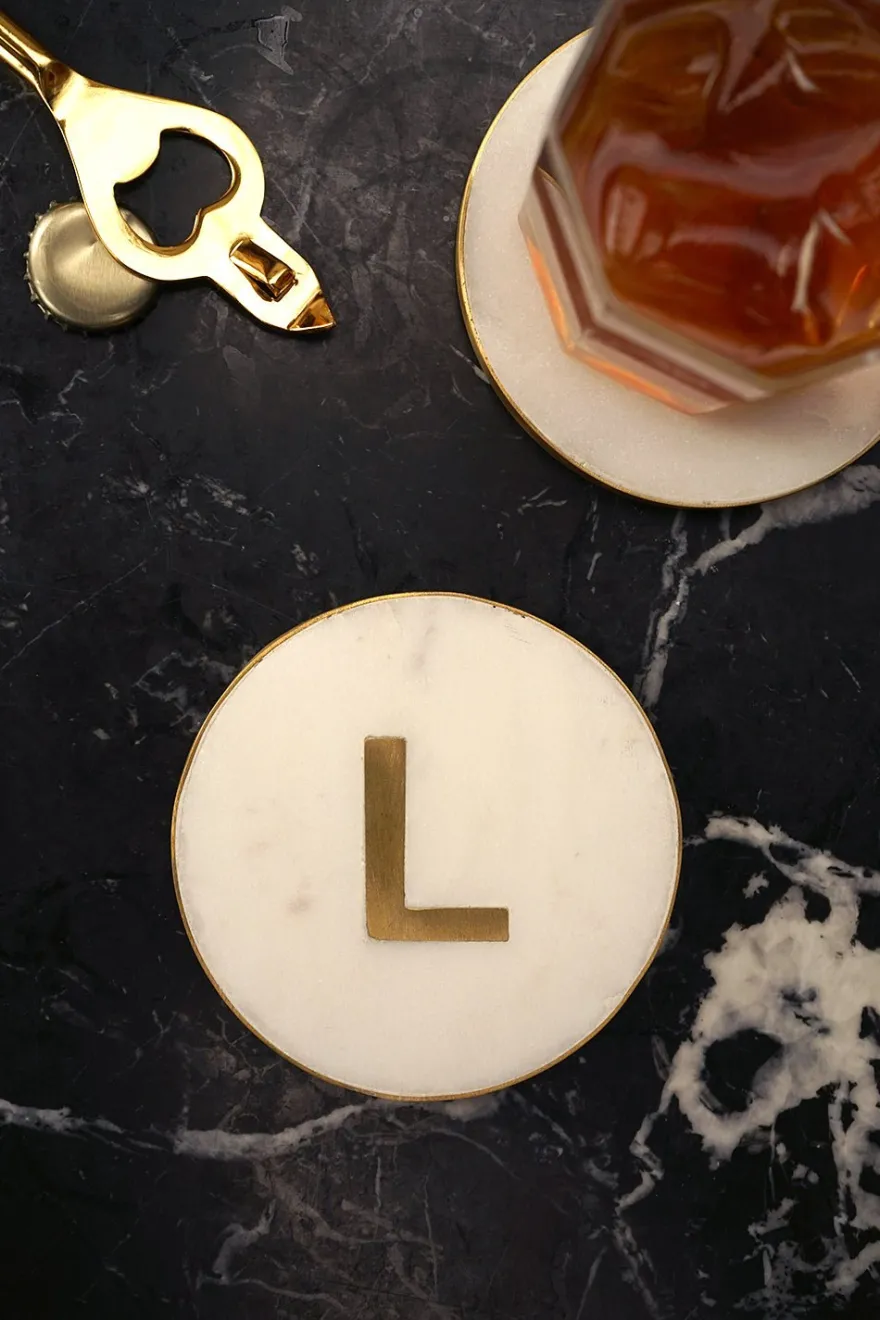En el centro del posavasos, se destaca la inicial personalizada, realizada en latón dorado, que agrega un toque de distinción y lujo.