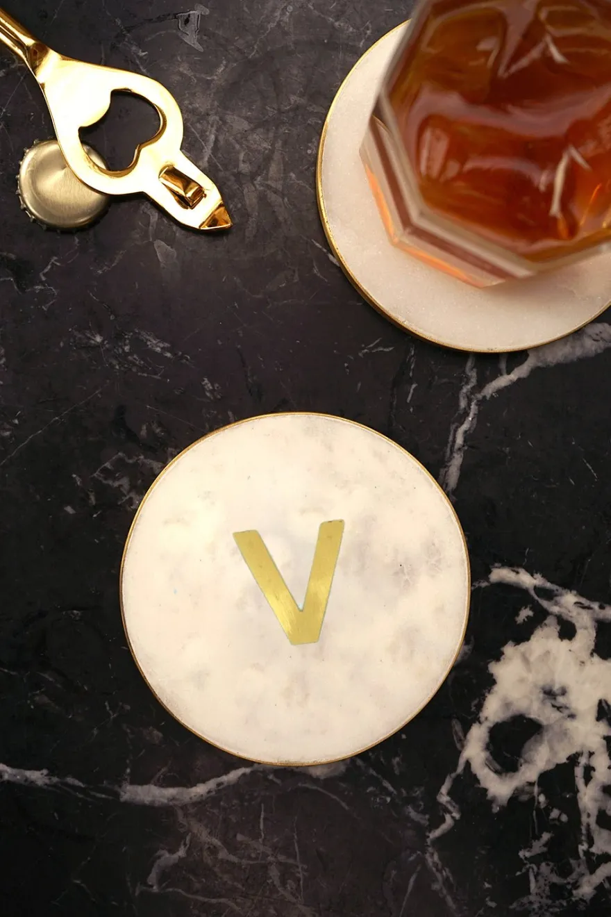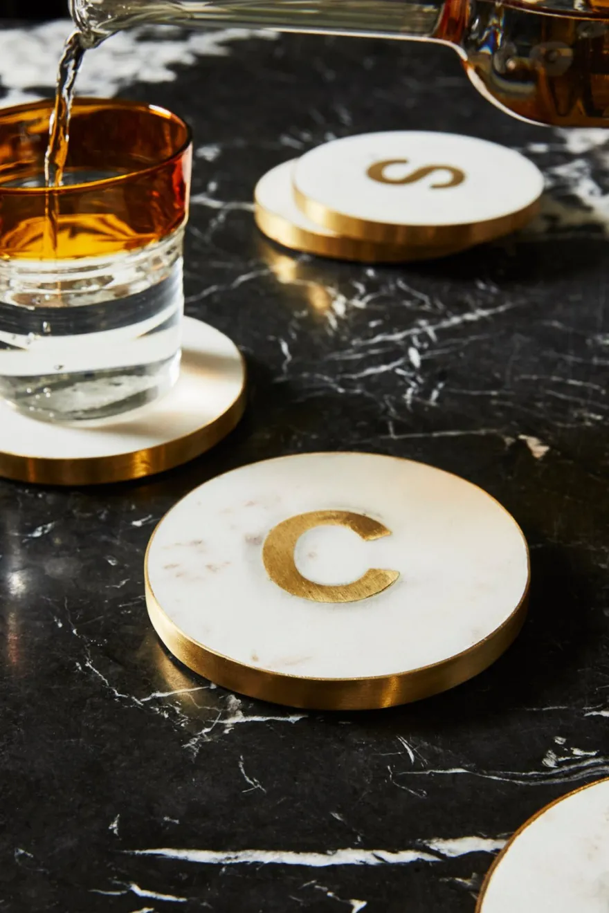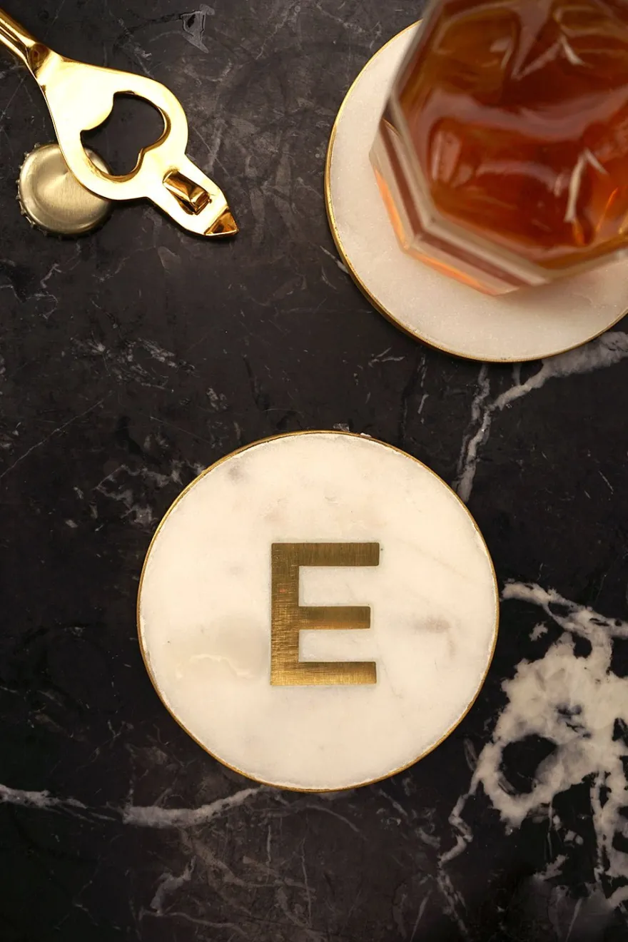 En el centro del posavasos, se destaca la inicial personalizada, realizada en latón dorado, que agrega un toque de distinción y lujo.