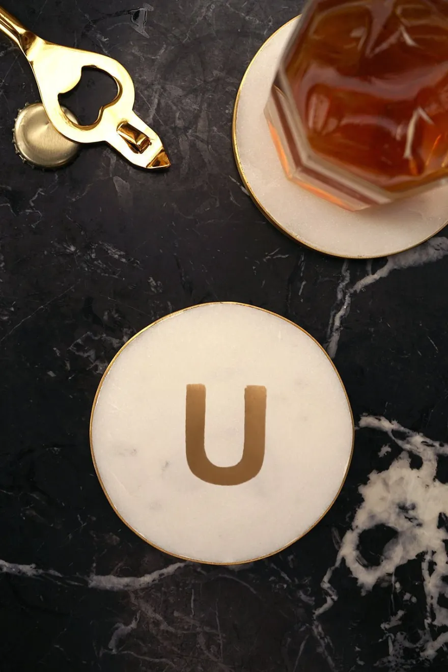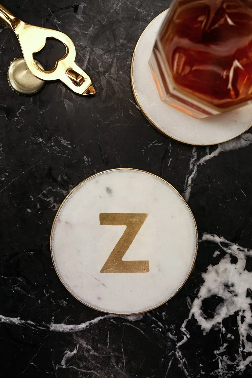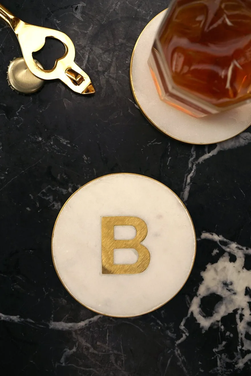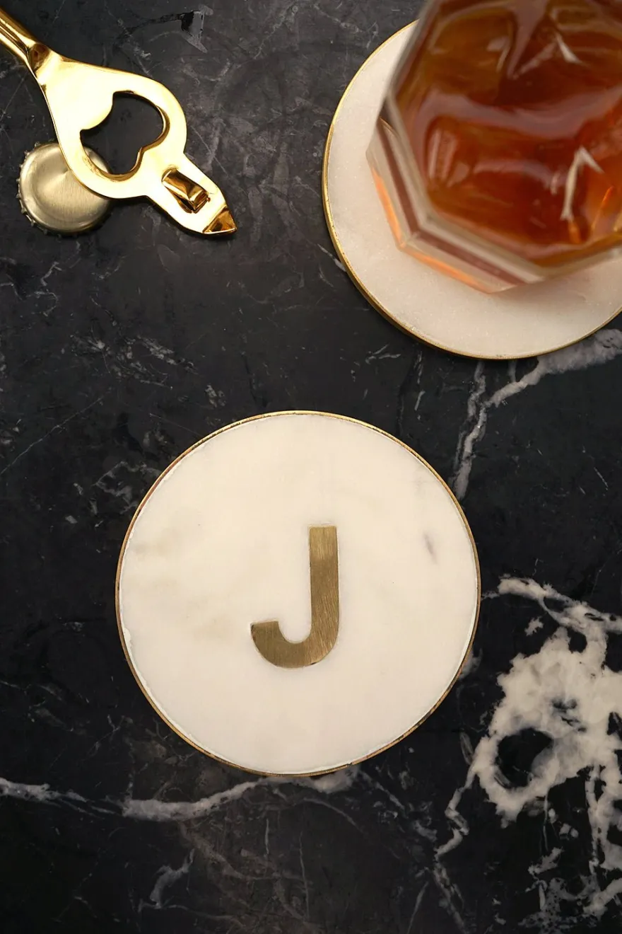 En el centro del posavasos, se destaca la inicial personalizada, realizada en latón dorado, que agrega un toque de distinción y lujo.