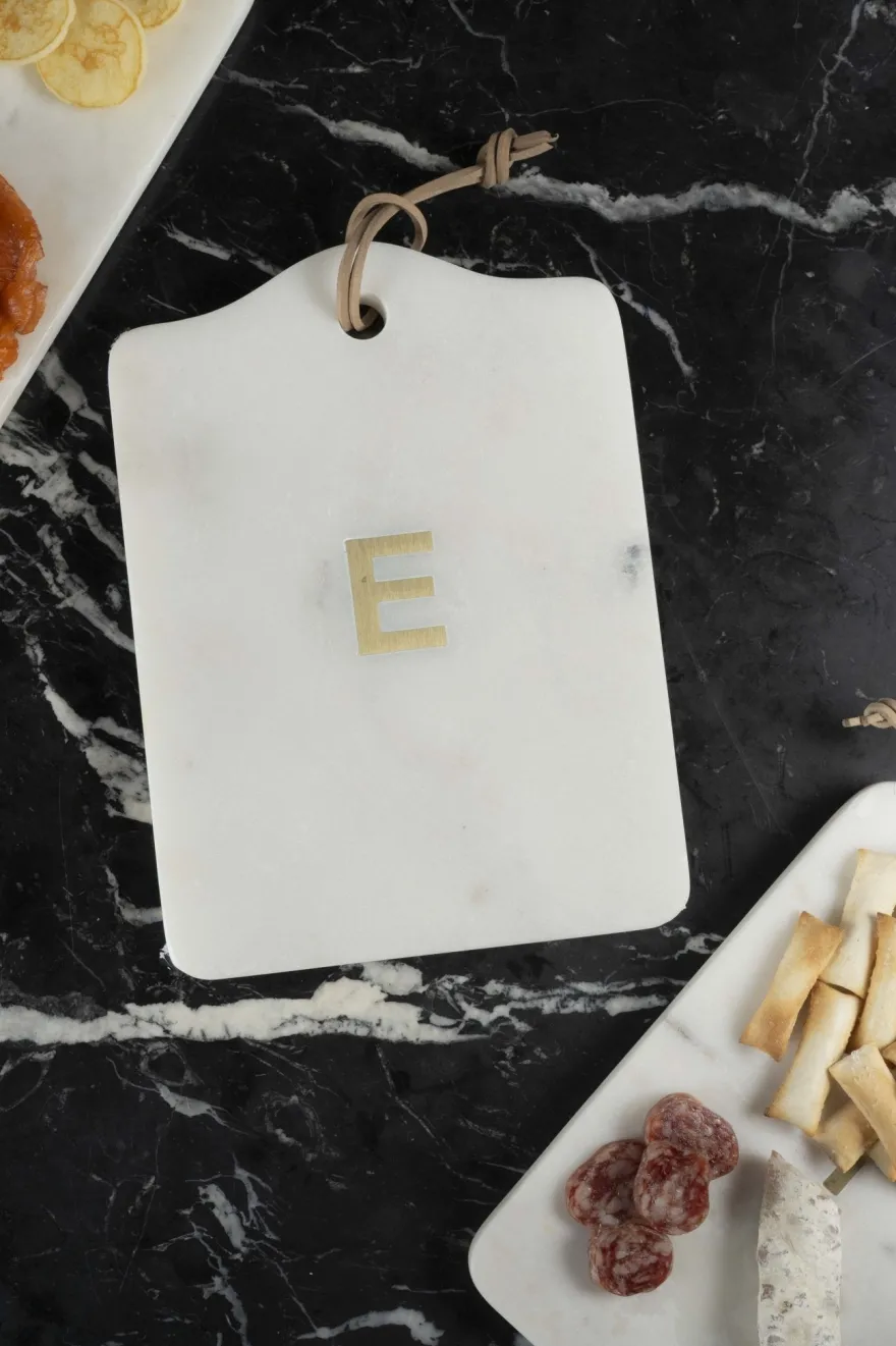 Tabla rectangular de mármol con inicial en latón en color dorada, ideal para servir quesos y embutidos.