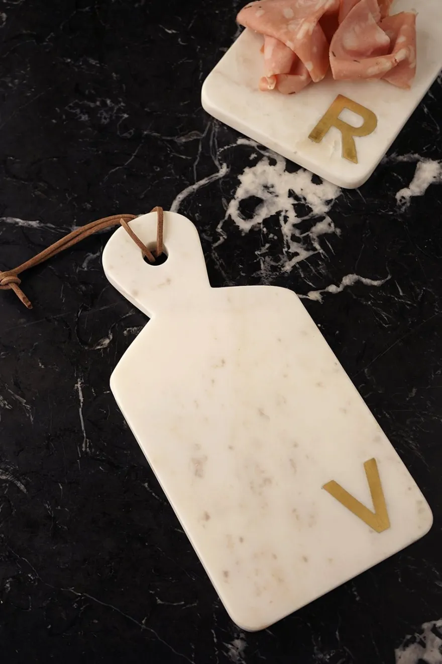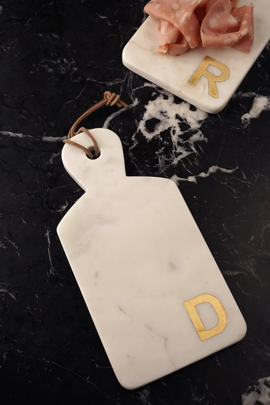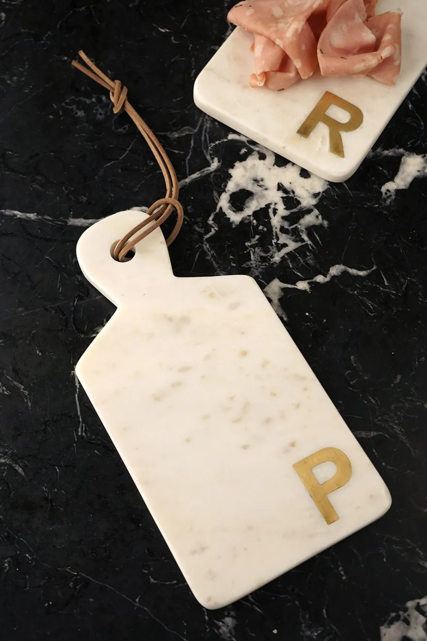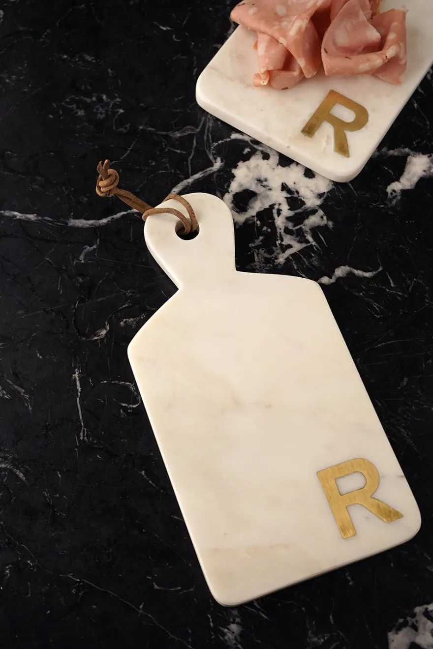Tabla de mármol con inicial en latón, ideal para servir quesos y embutidos.