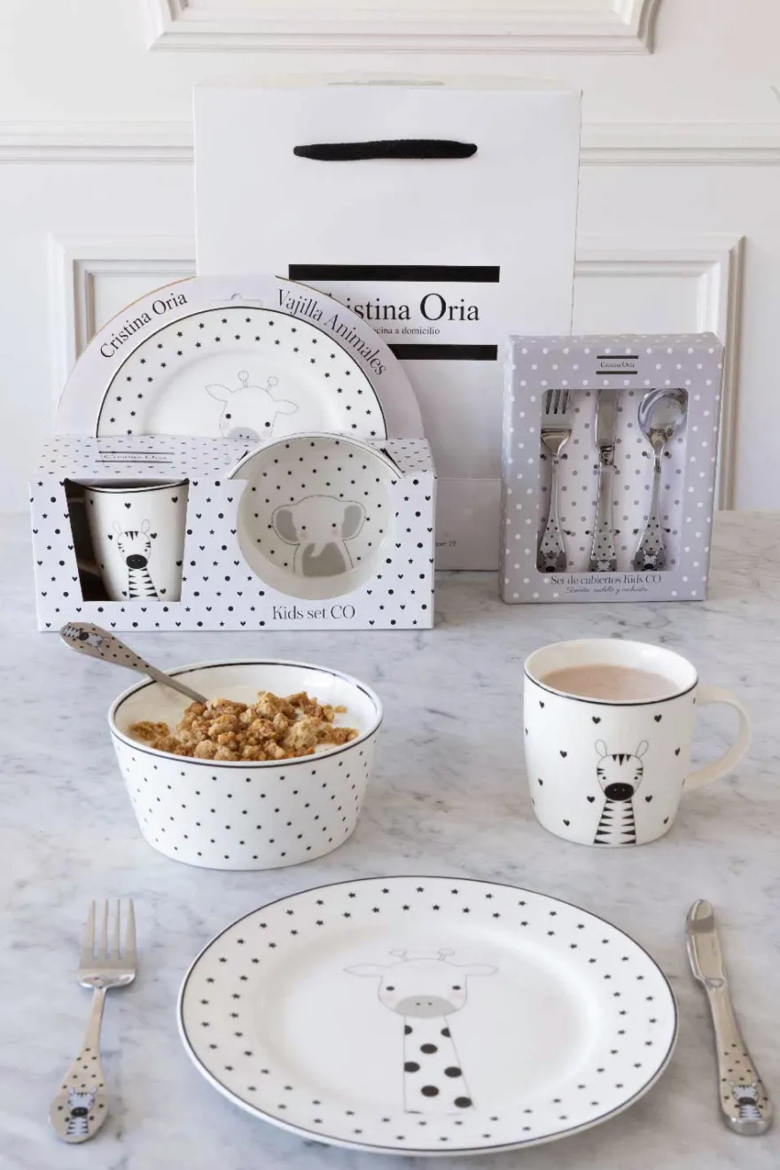 Set de nuestra vajilla y cubiertos infantiles con diseño propio Cristina Oria en colores blancos y negros.