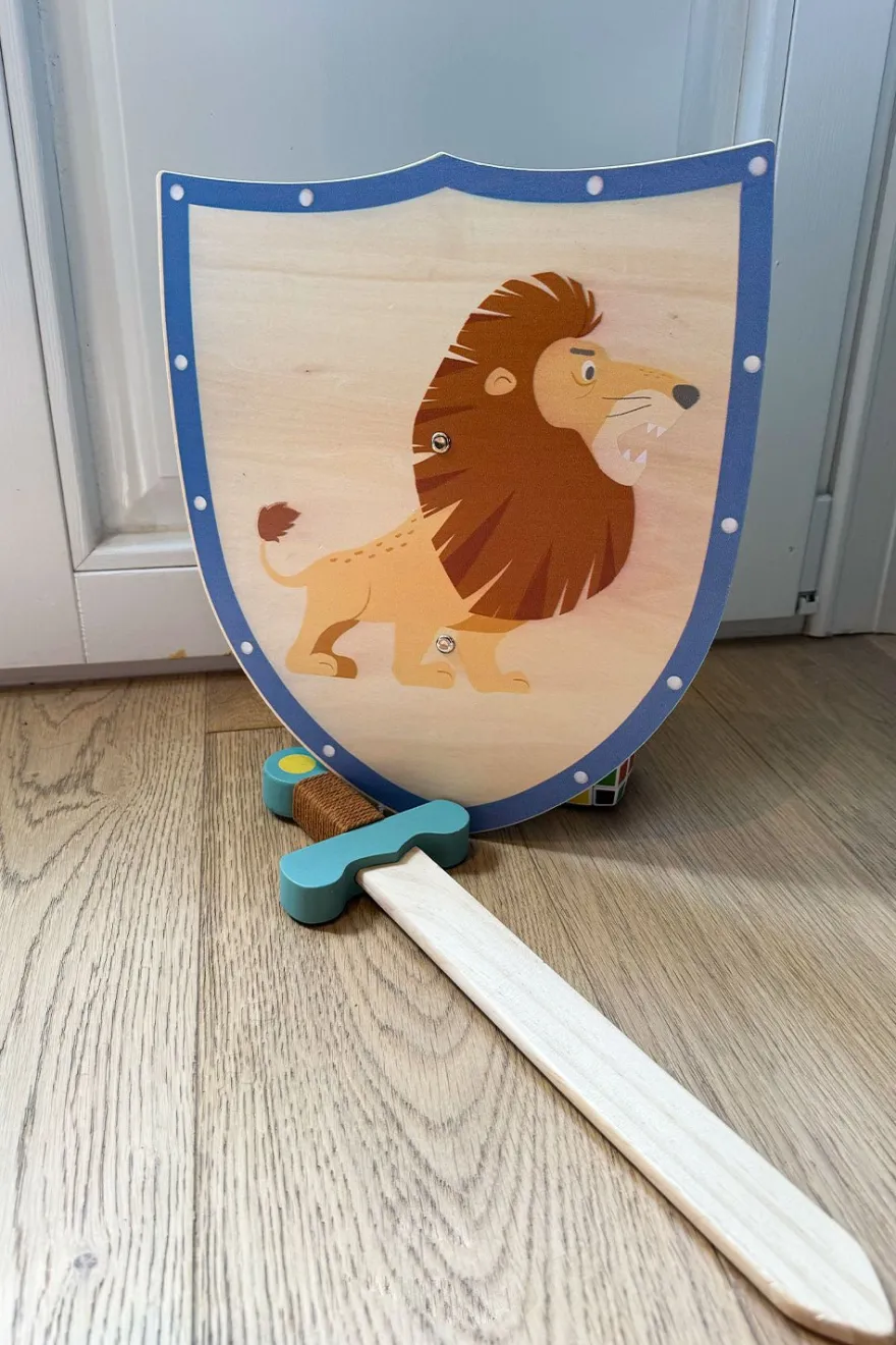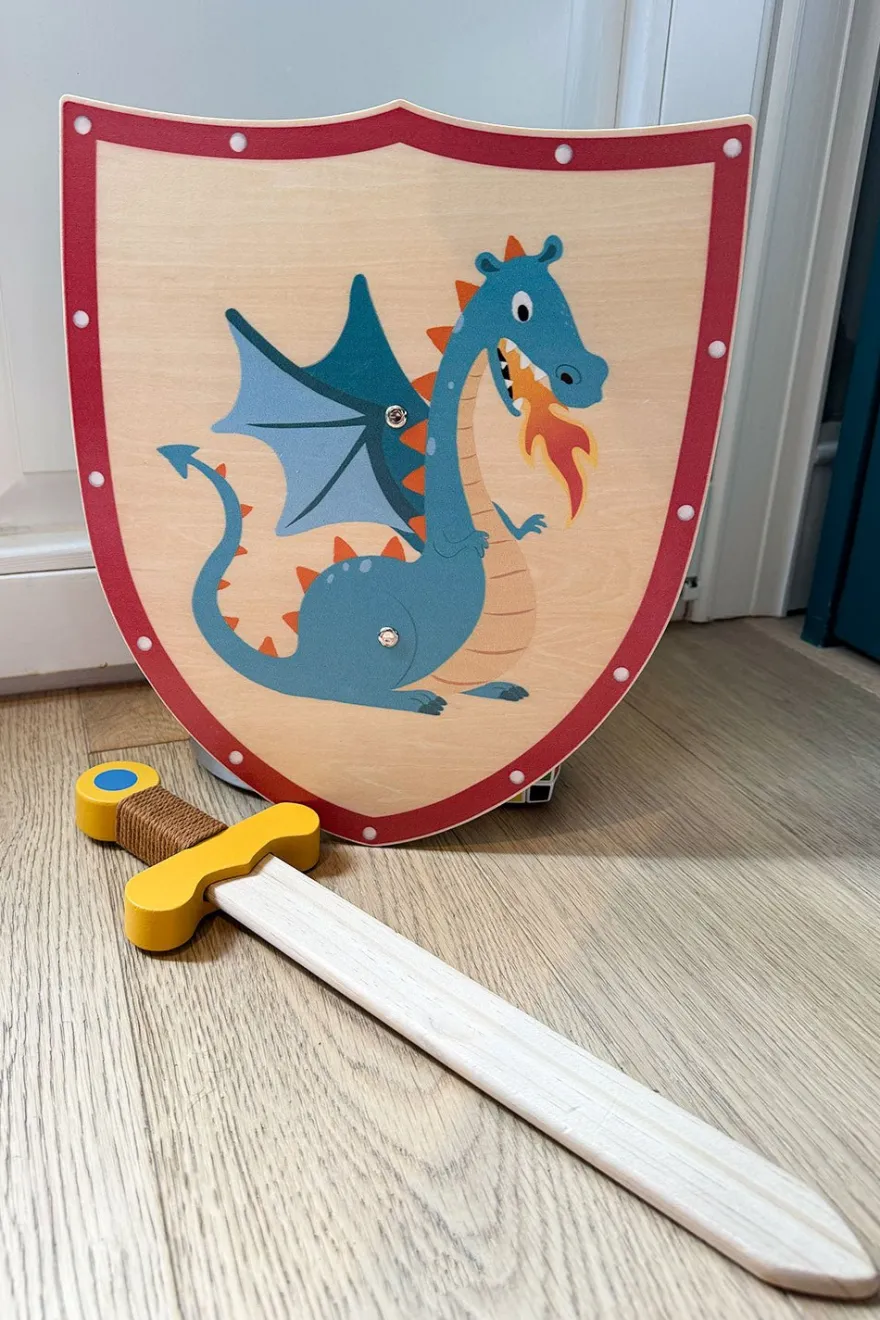 Set de juguete de escudo y espada de madera, diseñado especialmente para pequeños valientes.